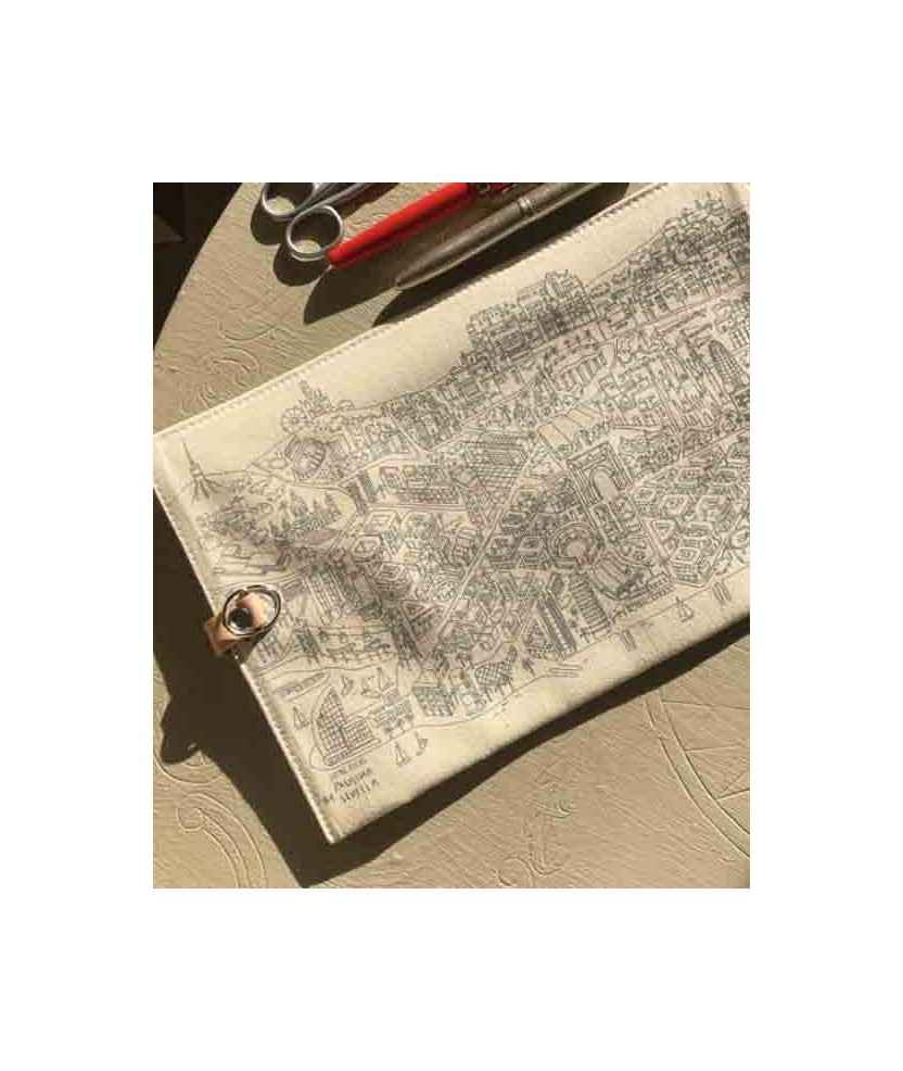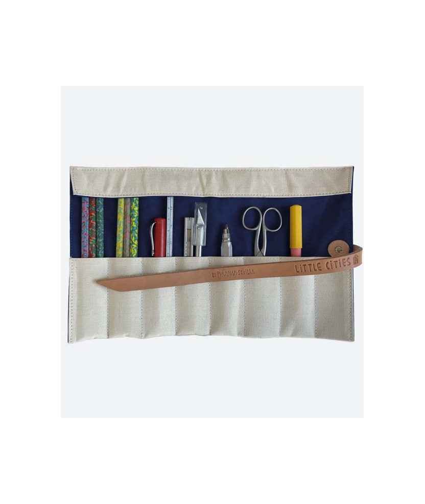 Estuche enrollable hecho a mano con una ilustración original de Paulina Sevilla, en homenaje a Barcelona, ciudad entre la montaña y el mar. Permite guardar lápices, pinceles, herramientas de dibujo o incluso maquillaje de forma ordenada. Confeccionado en lona cruda 100% algodón y estampado en serigrafía, con cierre de vaqueta grabada en seco. Medidas: 32x20 cm.