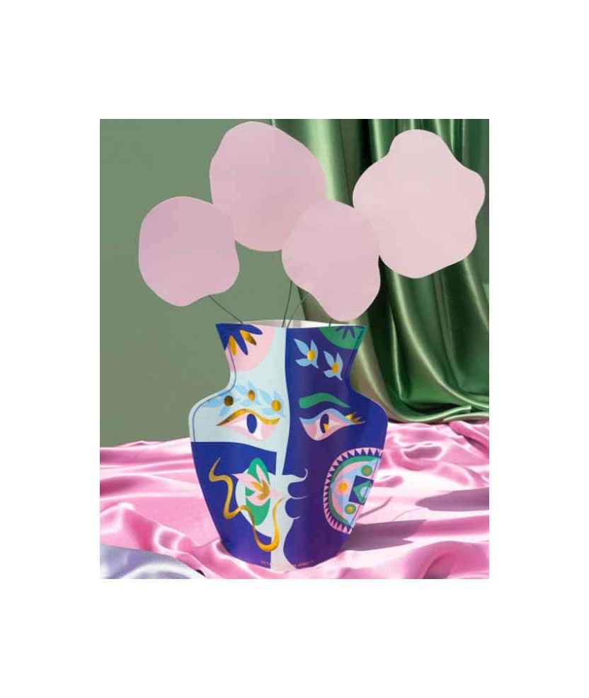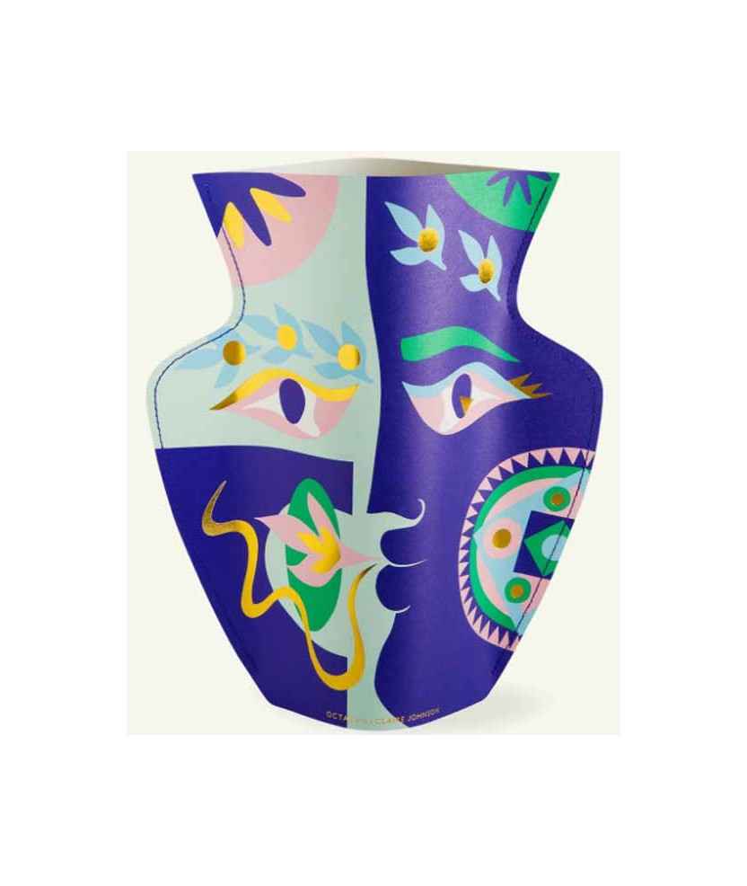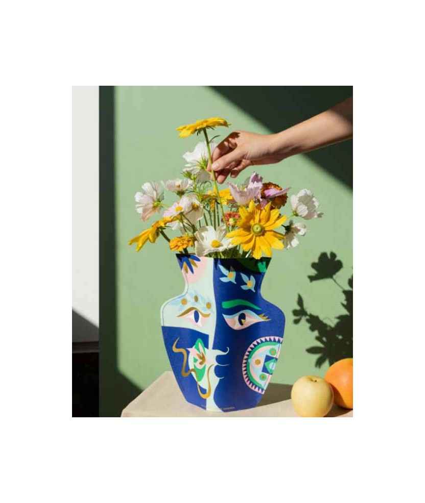 Última colaboración con la artista multidisciplinaria Claire Johnson. Trabajando con el tema de 'dos dioses, dos amantes', la interpretación artística de Claire resultó en dos collages de papel con mandalas giratorias, coronas de laurel y ojos brillantes, que se adaptan en impresiones en los jarrones. El resultado es un conjunto de jarrones de papel con rostros fascinantes de dioses antiguos que susurran palabras de amor. Medidas: 26'5 x 29 cm. Material: Papel resistente al agua. Impresión: Offset con estampado en lámina dorada.