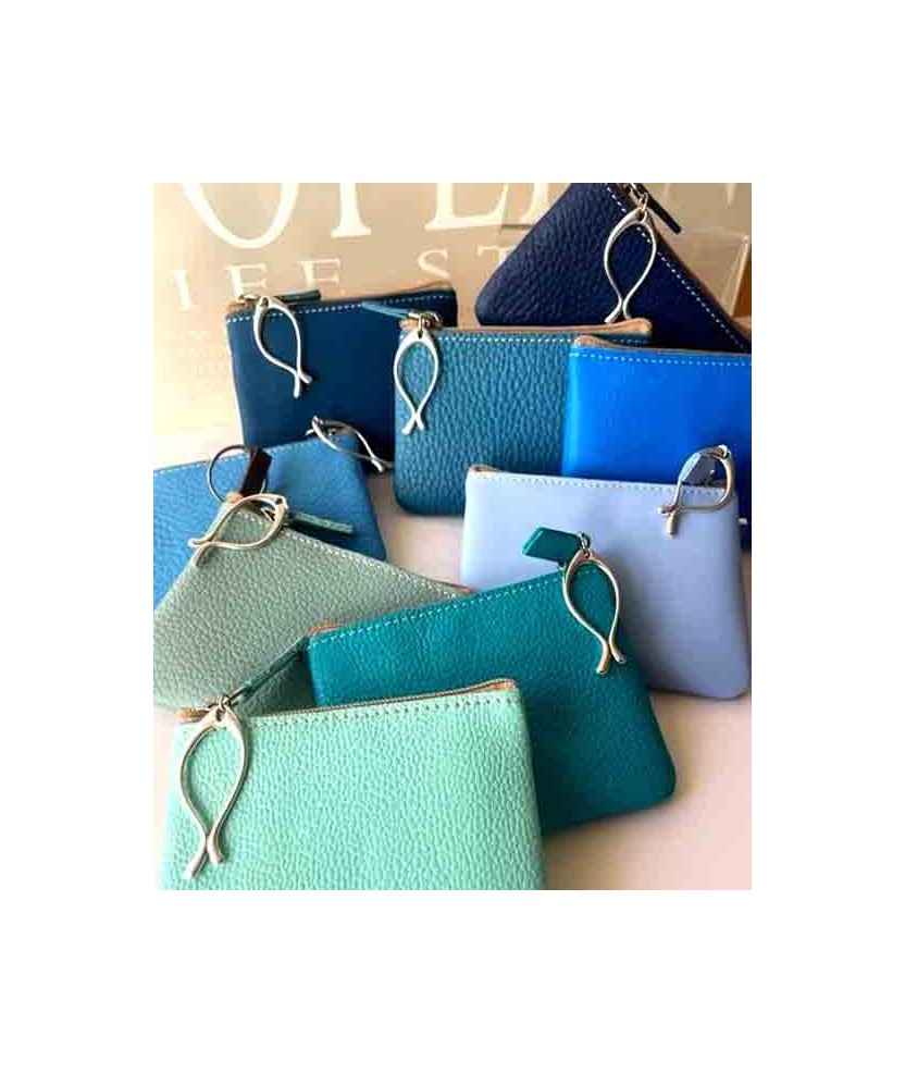 Monedero llavero de cuero, elaborado por Popelin. Disponible en varios colores, combina diseño artesanal y funcionalidad. Cierre con una pieza metálica bañada en plata que reproduce la silueta de un pequeño pez. Piezas únicas de fabricación cuidada, destacadas por su tacto suave y su durabilidad.