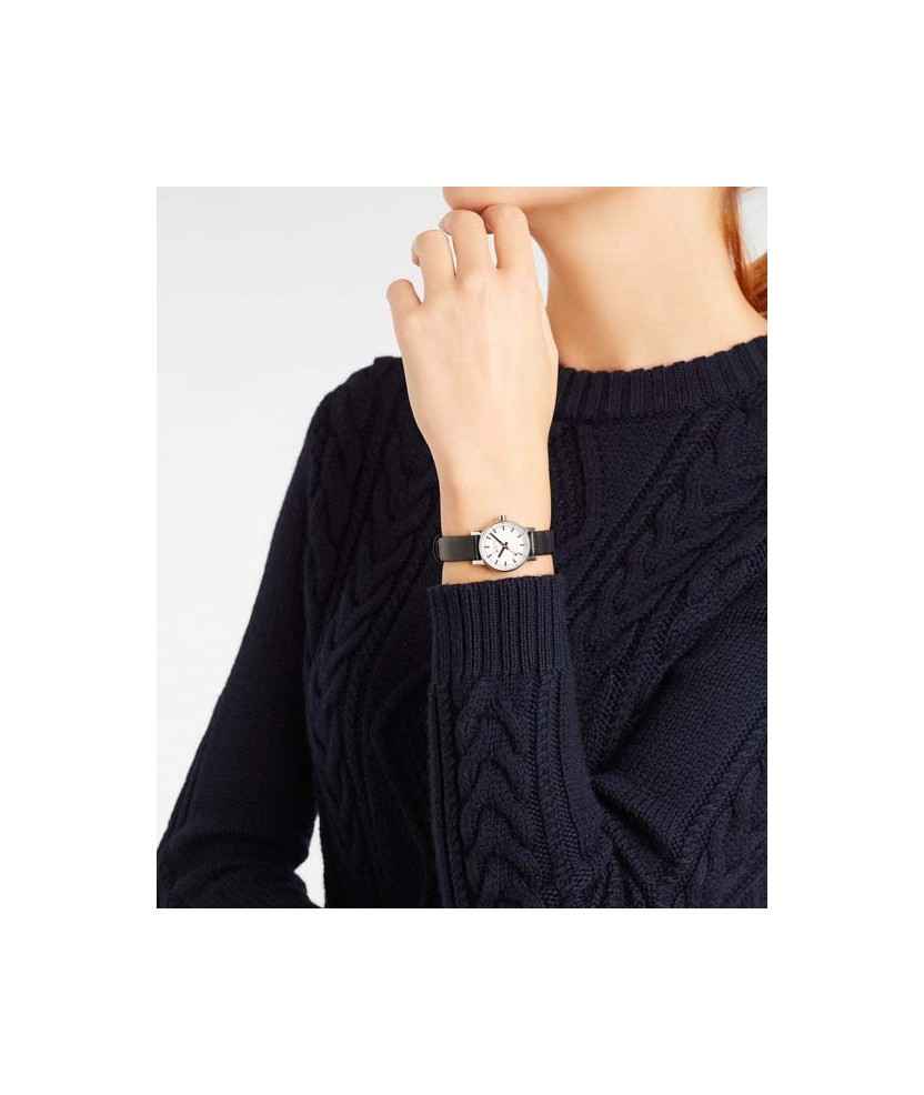 Reloj suizo Mondaine SBB Evo2 Petite con caja de acero pulido de 26 mm de diámetro y cristal de zafiro ligeramente convexo. Su diseño destaca por las proporciones equilibradas y la esfera de gran legibilidad, característica de la colección Mondaine. Incorpora correa de piel vegana negra y es resistente al agua hasta 30 metros. Incluye garantía oficial de 3 años.