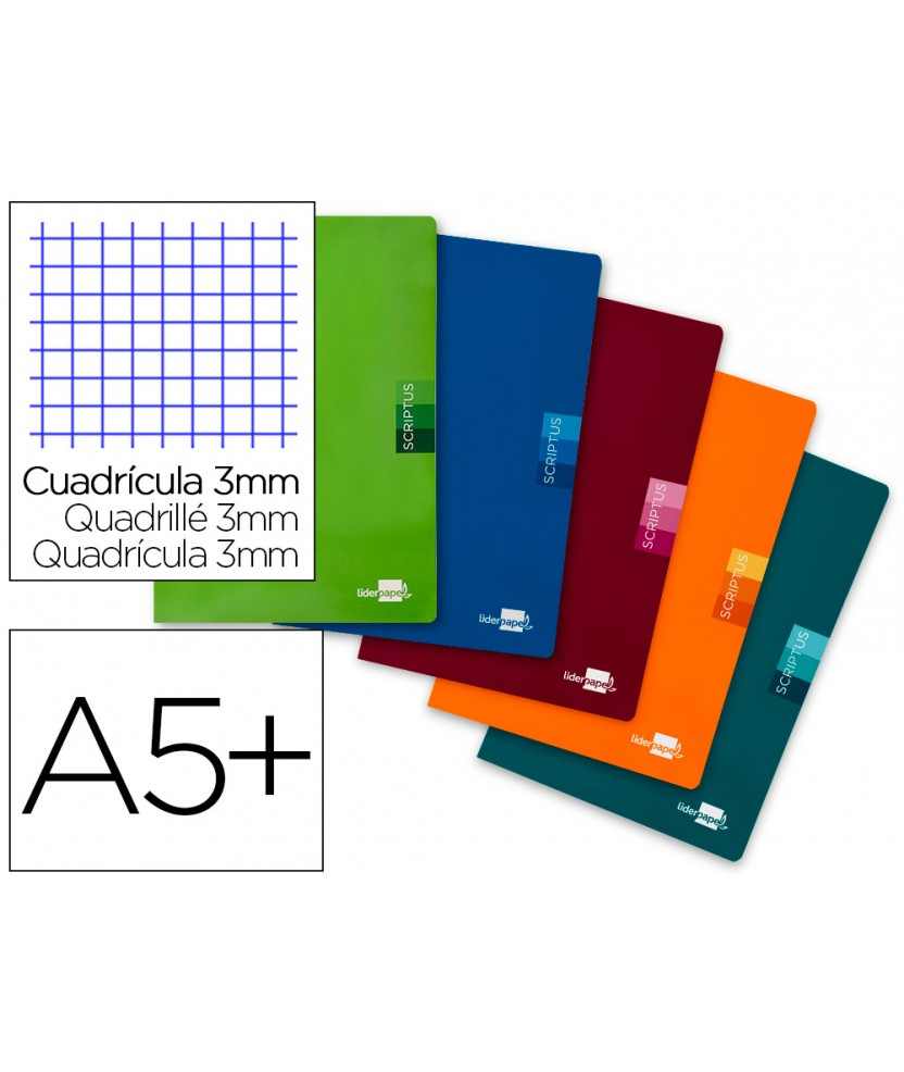 Libreta liderpapel scriptus a5 plus 48 hojas 90gr cuadro 3mm con margen . Tapa de papel estucado de 270 g/m² y plastificado brillo. 48 hojas. Papel 90 g/m² de óptima calidad. Muy resistente. No traspasa la tinta. Con margen. Colores surtidos.