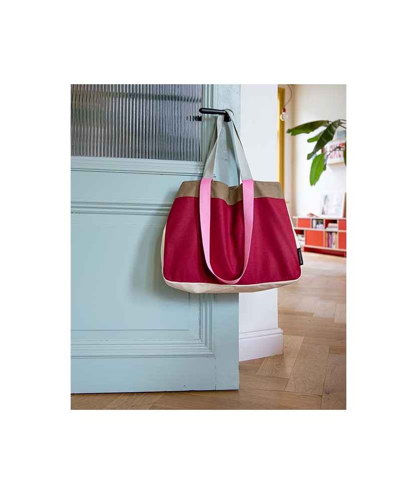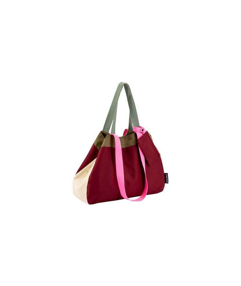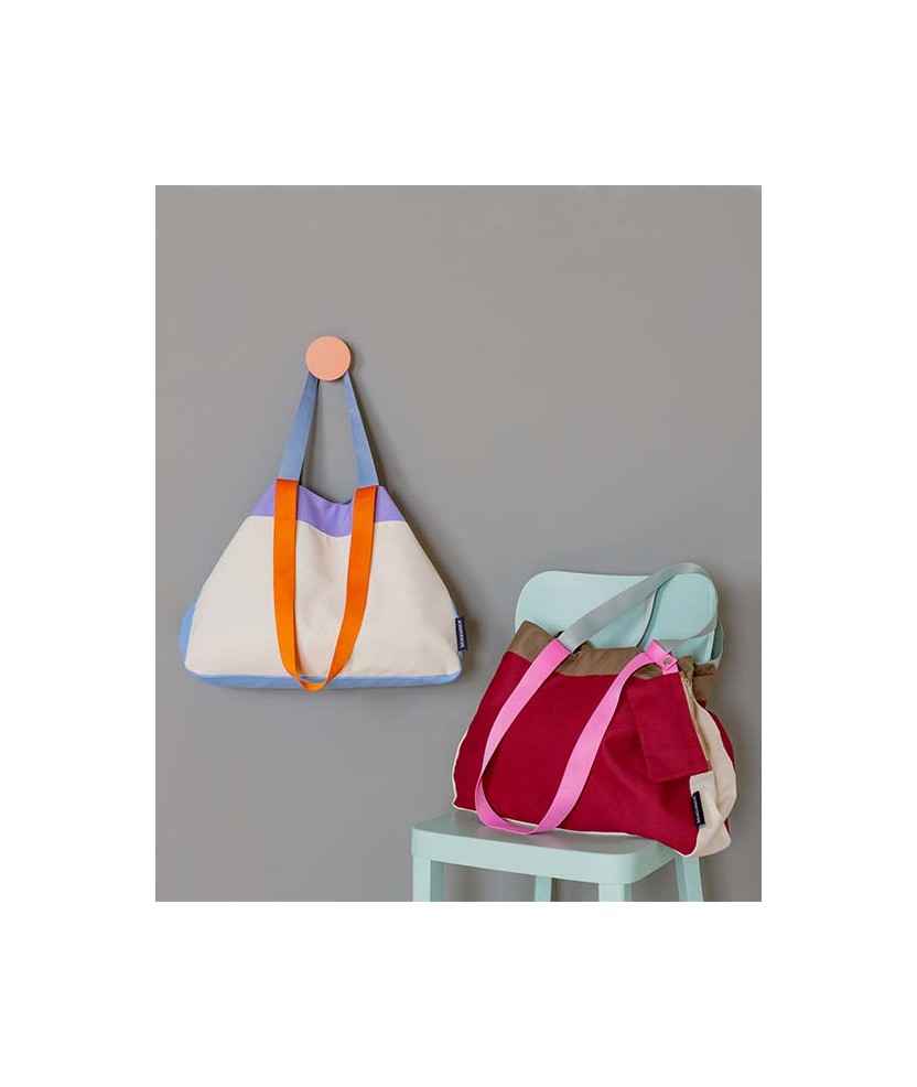 Bolso de lona con botón magnético para cerrar, compuesta por una bolsa desmontable que se puede fijar a la bandolera mediante trabilla con botón de presión, un bolsillo interior con cremallera y una correa de cierre con botón de presión para reducir el tamaño del bolso. Disponible en varias combinaciones de colores. Material: exterior y forro: 100 % algodón, bolsa: 100 % algodón, correa: 100 % polièster. Mides: 50x16x36 cm.