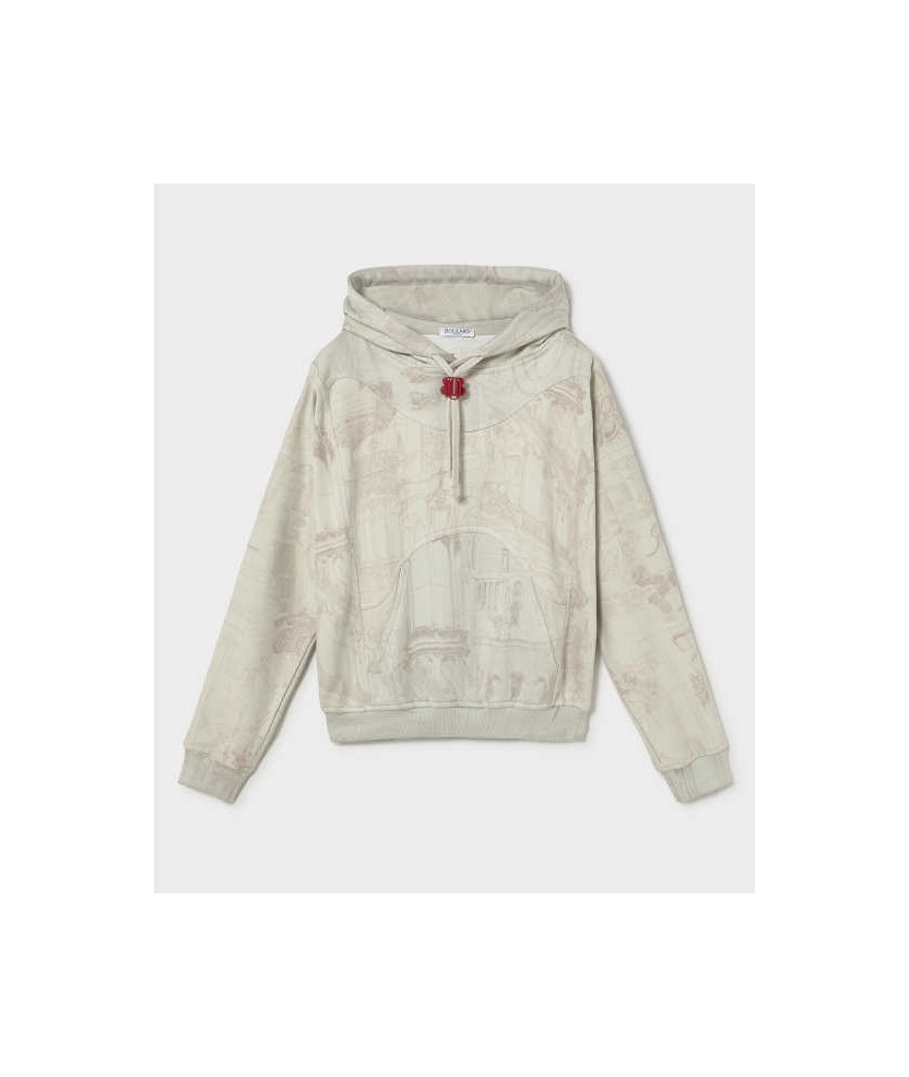 Sudadera oversize de algodón con patrón de costuras curvas y mangas japonesas. Presenta un estampado integral de bocetos de la arquitectura modernista de Barcelona y el nuevo botón de la colección en la espalda. 100% algodón grueso. Disponible en tallas S-XL. Diseñado y hecho en Barcelona por Ugo Boulard dentro del programa Barcelona Fashion Forward 2025.