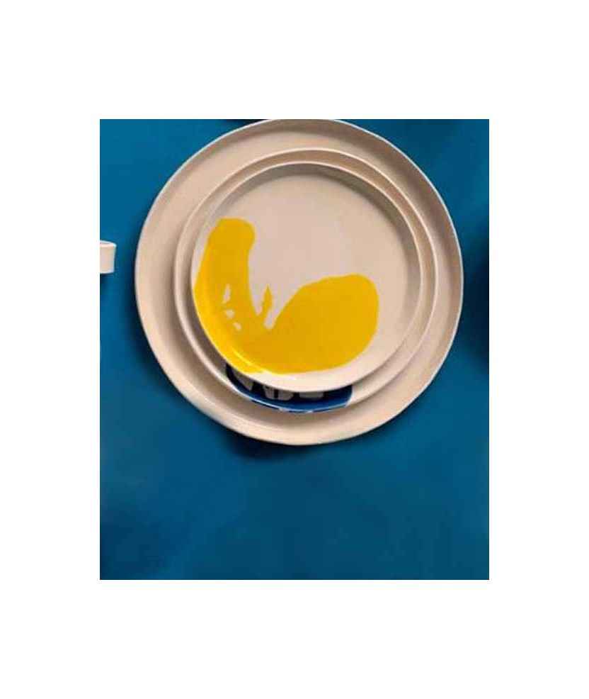 El Set está formado por piezas de gres pintadas a mano con engobe de colores, con un acabado brillante sin plomo. Su proceso de fabricación incluye un bizcocho y una cocción que garantizan su durabilidad. (Ø 24cm), 1 plato de postre (Ø 20cm) y 1 plato de pan (Ø 13cm). Set disponible en tres colores no intercambiables: azul, amarillo y negro.