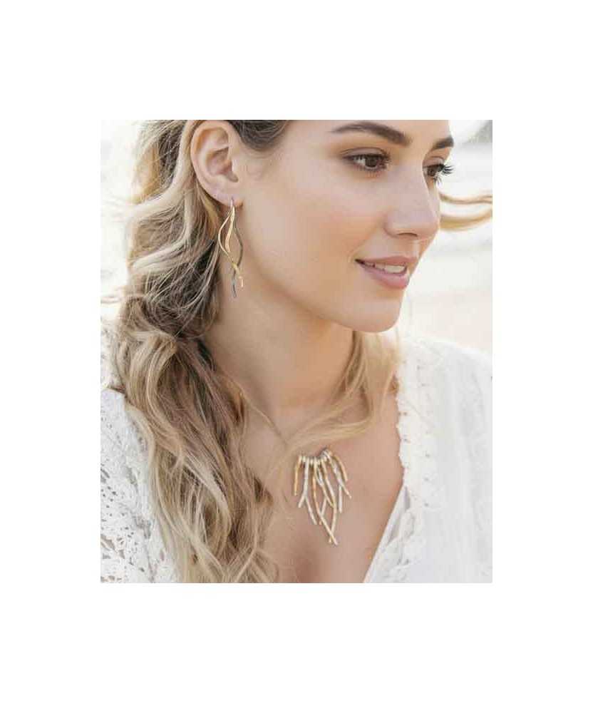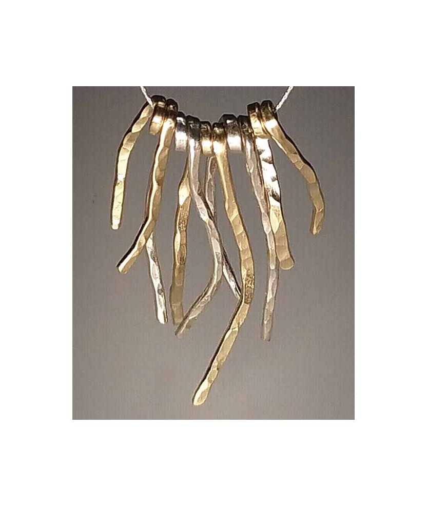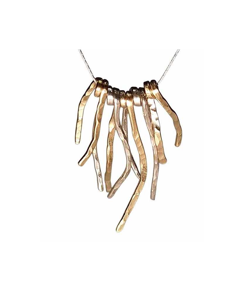 Collar PossiDona de plata de ley hechos a mano con cinco posidonias: tres bañadas en oro de 3 µ y dos de plata. La combinación de colores aporta contraste y define un diseño equilibrado. La cadena de plata tiene una longitud de 42 cm, adaptándose cómodamente al cuello. Pieza con líneas limpias y detalle artesanal.