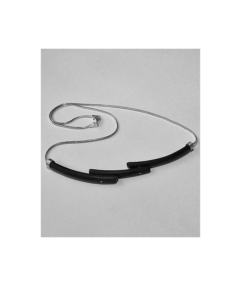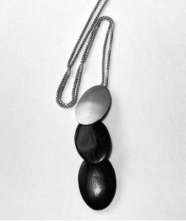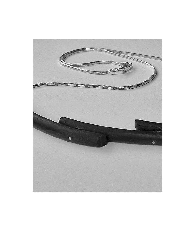 El collar Toran de Pilar Marsà es una pieza escultórica única, elaborada con ébano y plata. La combinación de estos materiales nobles y sus formas depuradas reflejan la filosofía de la diseñadora: extraer la esencia de la materia hasta revelar su belleza interior. Cada pieza es artesanal e irrepetible, fruto de un trabajo que une naturaleza, emoción y elegancia contemporánea.
