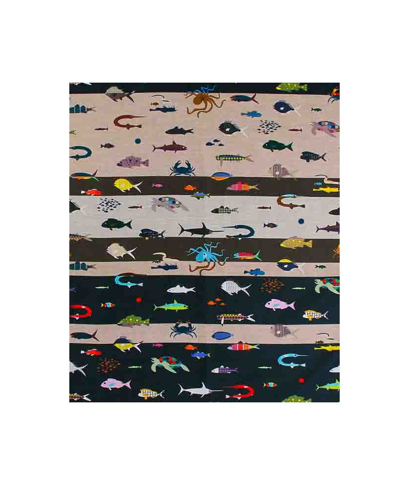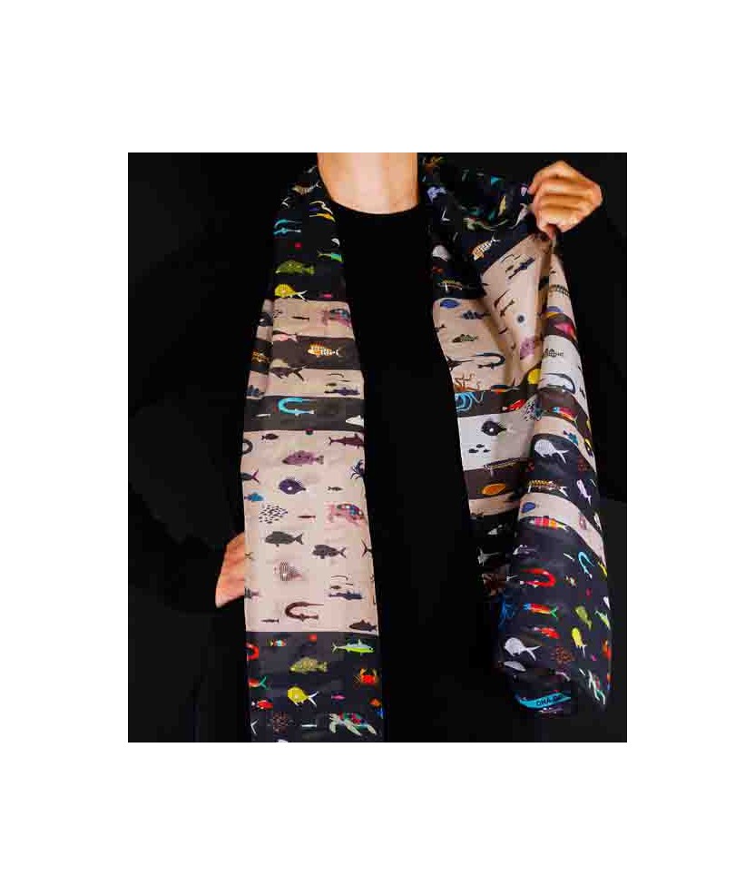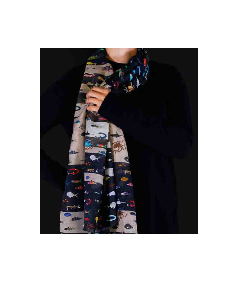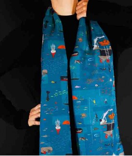Pañuelo suave y muy agradable al tacto con la piel, con una caída bonita. Pertenece a la colección Mar, impregnada la relación profunda del artista con el mar, representada como un universo submarino poblado de pescados, crustáceos e instrumentos humanos de navegación. Especies reales e imaginarias comparten espacio con el barco Calypso, utilizado por Jacques Cousteau en sus exploraciones y documentales. Composición: 70% algodón 30% seda. Medidas: 68x165 cm.