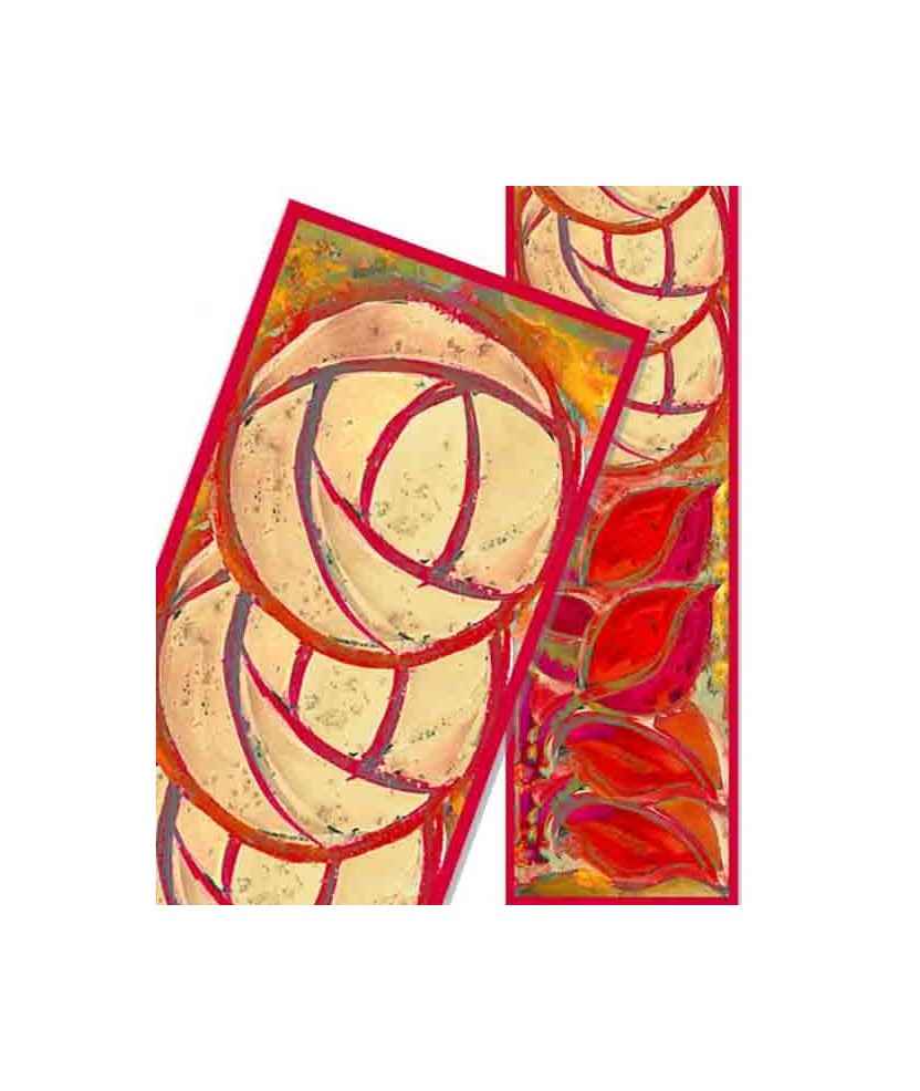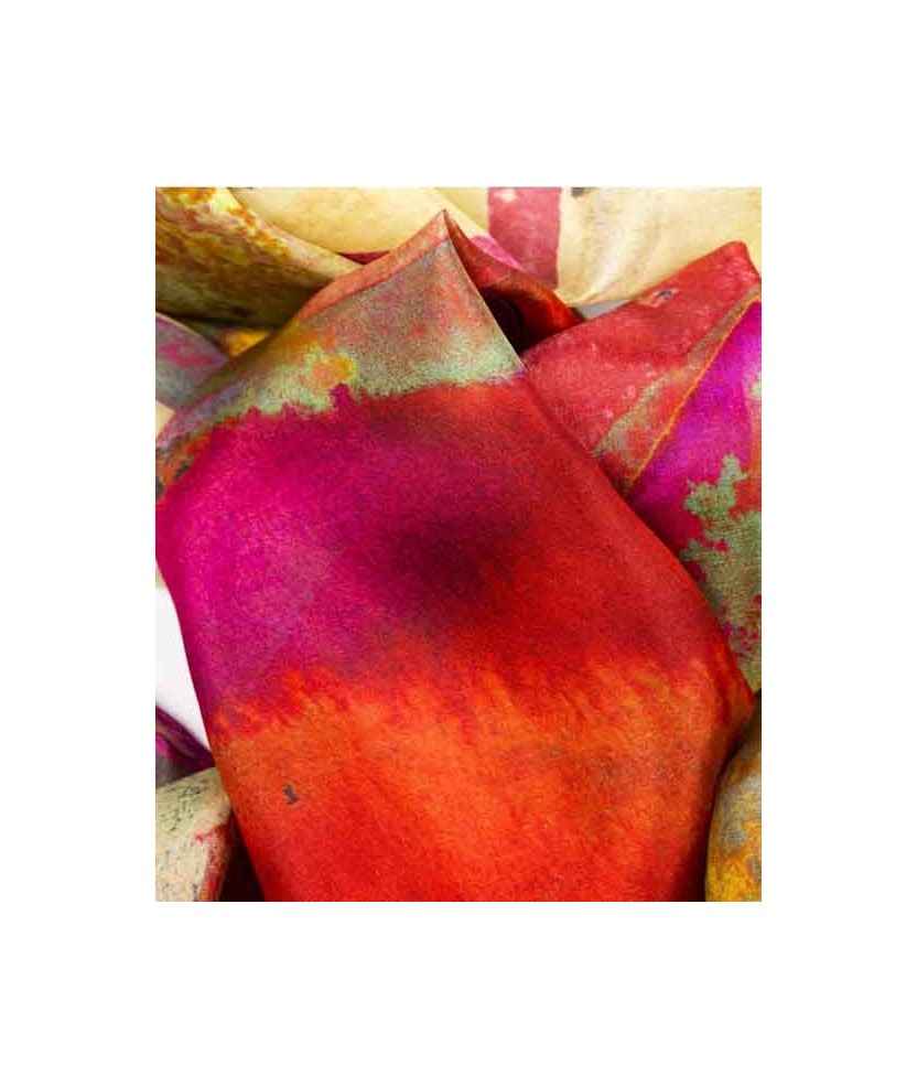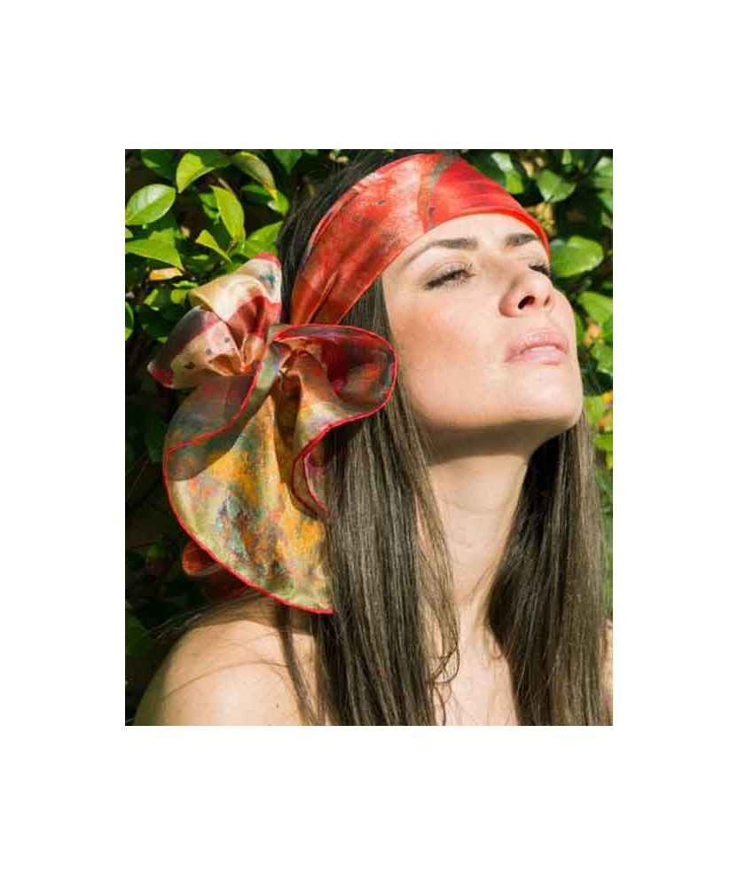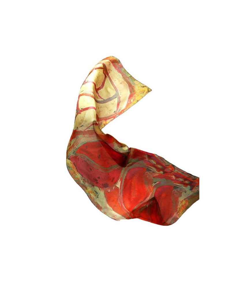 Fular de seda 100% natural diseño romántico de inspiración modernista y estampado floral, donde se expresa una rosa con tallo. En rojo granate y crema. Elegante y distinguido, complemento por una noche de ópera. Bordes finos cosidos a mano. Producción artesana limitada, realizado en Barcelona. Medidas: 180x45 cm.