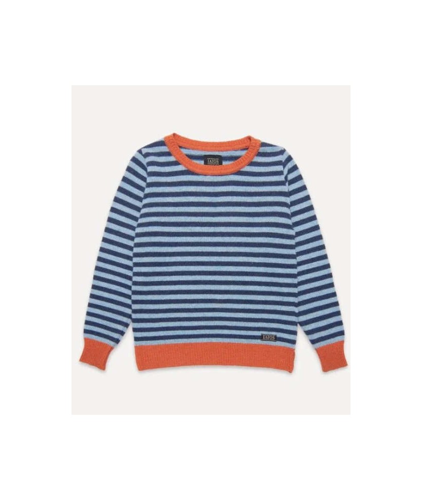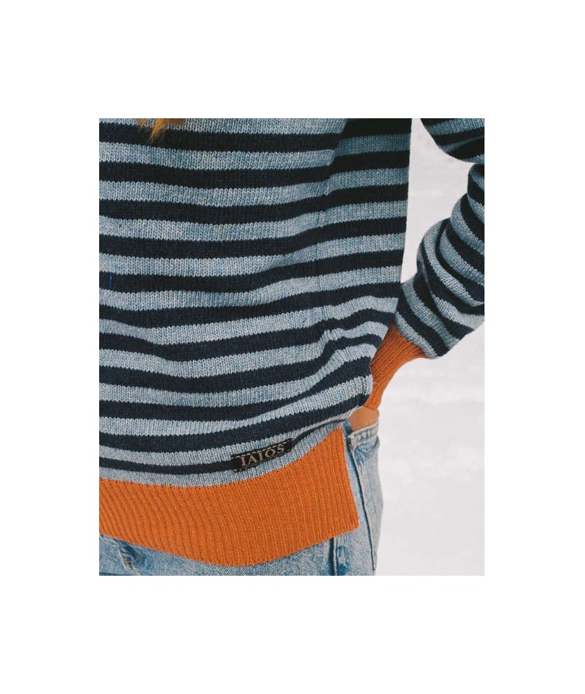 El jersey Truth de la marca IAIOS es uno de los más vendidos gracias a su diseño de rayas en colores azul y naranja y su versatilidad como básico para cualquier ocasión. Su corte recto y unisex favorece todo tipo de cuerpos, con pequeñas aberturas laterales para mayor comodidad. Recomendamos elegir una talla holgada para un ajuste más confortable. Hecho en Catalunya con hilo de punto reciclado, es una prenda sostenible y duradera. Material: 100% hilo reciclado (20% lana reciclada y 80% acrílico reciclado).