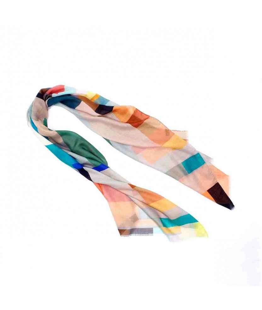 Pañuelo suave y muy agradable al tacto con la piel, con una caída hermosa. Pertenece a la colección Tons, impregnada por la abstracción geométrica inherente en la obra pictórica que Ona Boix lleva a cabo en paralelo al diseño textil, donde el color acaba siendo el protagonista indiscutible. Tejido de ligamento tafetán ligero elaborado con fibras finas de lana y seda. Disponible en ocho combinaciones de colores. Medidas: 68x165 cm.