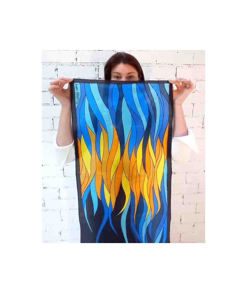 Pañuelo que pertenece a la colección 'Alta Artesanía', de seda 100% natural del tipo ponge 08 y de medidas 180x45cm pintado a mano con la técnica de la guta. Es un producto artesano de creación sostenible hecho con seda de primera calidad y con una vida útil muy larga. Consta del Distintivo de Artesanía otorgado por CCAM y la Generalitat de Cataluña. Son una serie limitada de 20 unidades con certificado de autenticidad de cada pieza y firma de la artista.