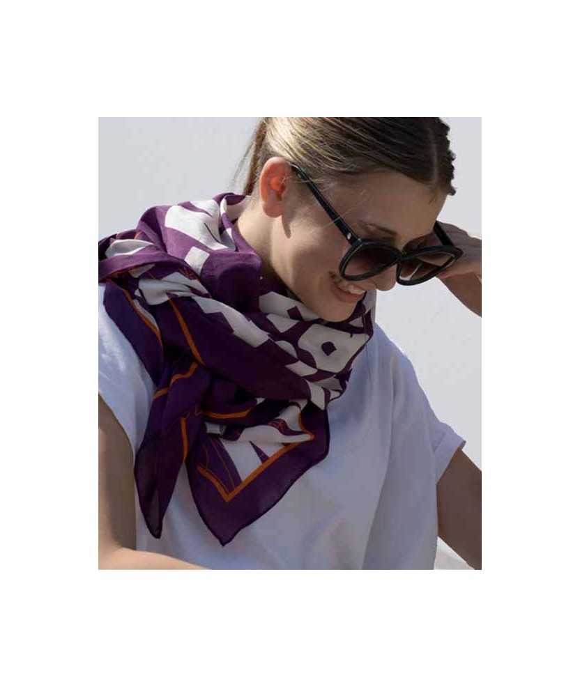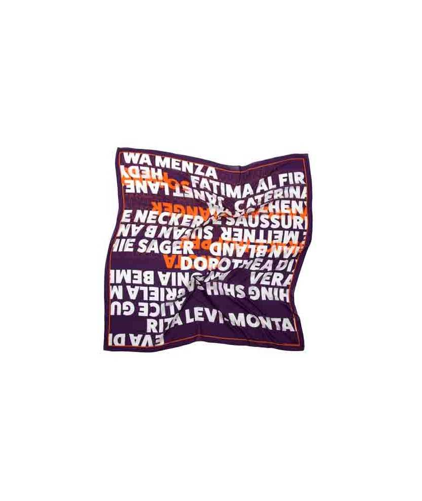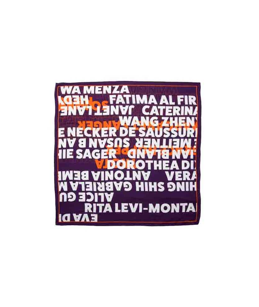 Pañuelo cuadrado exclusivo de edición limitada con el estampado 'Judy'. Con este pañuelo llevarás contigo a un montón de mujeres extraordinarias, dando a otras personas la oportunidad de descubrirlas también. Muchas de las mujeres representadas en este diseño también lucharon por el derecho de las mujeres a determinar sus propios caminos. Disponible en tres combinaciones de colores: Azul/verde, verde azulado/rojo llama, y morado/blanco. Dobladillo hecho a mano. Composición: 70% algodón 30% seda. Medidas: 132x132 cm.