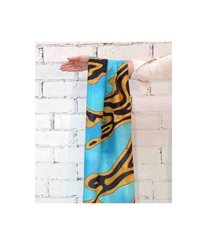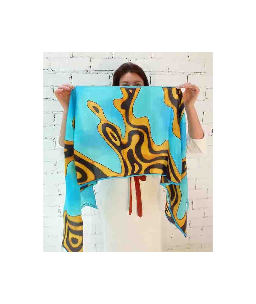 Pañuelo que pertenece a la colección 'Alta Artesanía', de seda 100% natural del tipo ponge 08 y de medidas 180x45cm pintado a mano con la técnica de la guta. Es un producto artesano de creación sostenible hecho con seda de primera calidad y con una vida útil muy larga. Consta del Distintivo de Artesanía otorgado por CCAM y la Generalitat de Cataluña. Son una serie limitada de 20 unidades con certificado de autenticidad de cada pieza y firma de la artista.