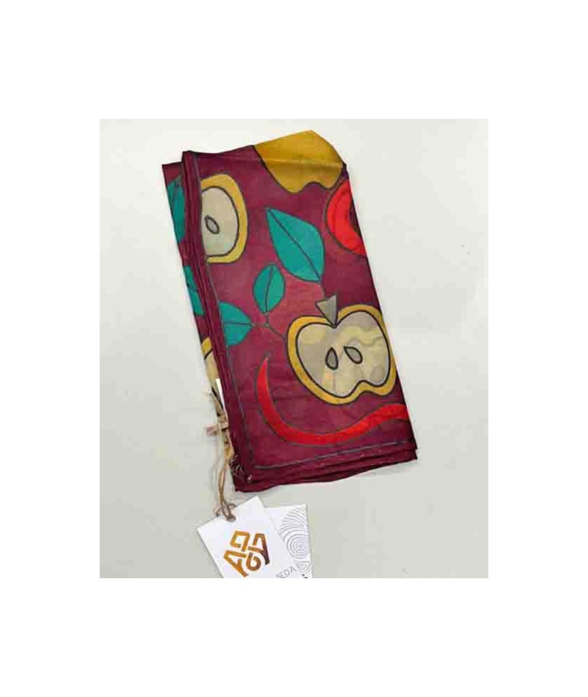 Pañuelo que pertenece a la colección 'Frutos Prohibidos', de seda 100% natural del tipo ponge 05 y de medidas 45x45cm pintado a mano con la técnica de la guta. Es un producto artesano de creación sostenible hecho con seda de primera calidad y con una vida útil muy larga. Consta del Distintivo de Artesanía otorgado por CCAM y la Generalitat de Cataluña.