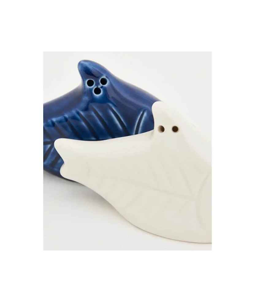 Set de salero y pimentero con un diseño encantador de peces, uno blanco y otro azul. Este conjunto crea un contraste visual atractivo que eleva cualquier comida. Hechos de cerámica de alta calidad, no solo son prácticos para el día a día, sino que también aportan un aire marinero y estilizado a tu cocina. Medidas: 6x9 cm.