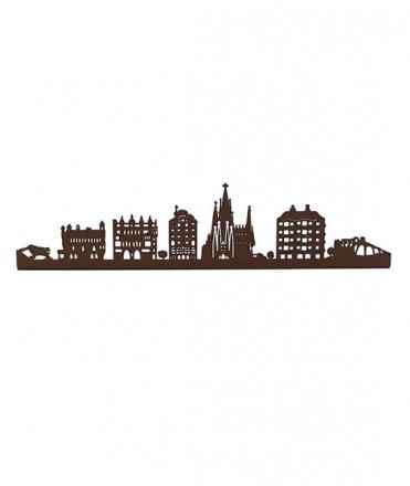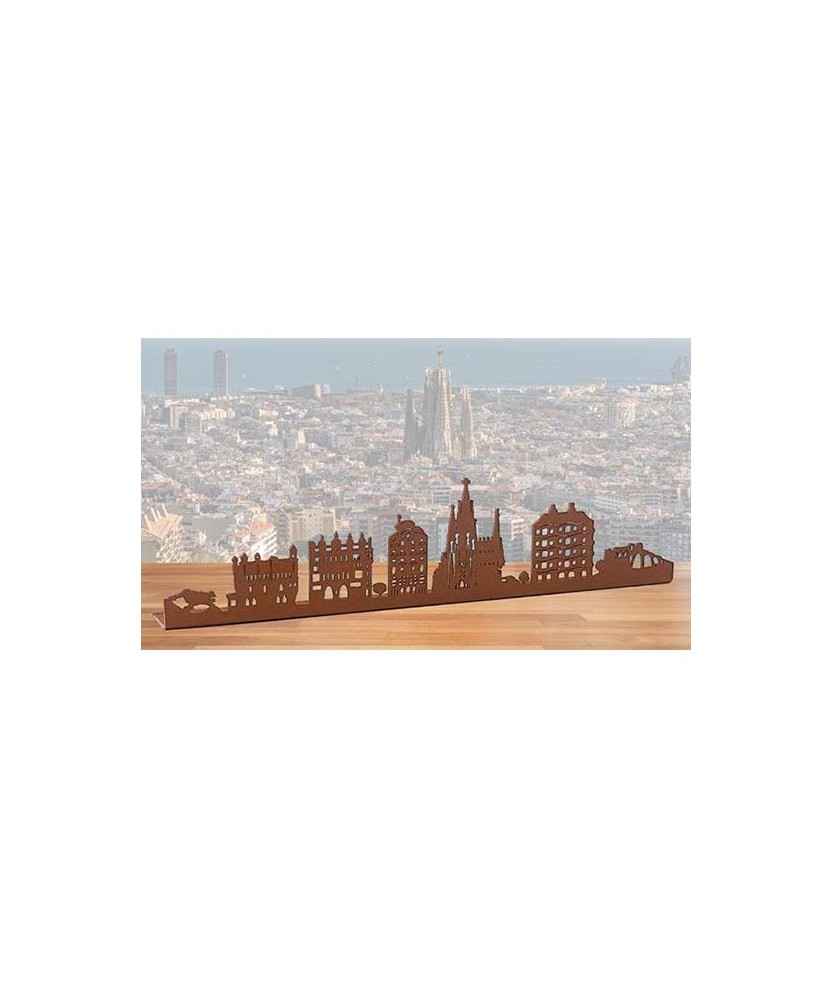 Skyline con algunas de las obras que el arquitecto catalán Antoni Gaudí proyectó en la provincia de Barcelona. De izquierda a derecha: el dragón del Park Güell, la Casa Vicens, el Palau Güell, la Casa Batlló, la Sagrada Familia, la Pedrera y la Cripta Güell. De color óxido. Medida: 25 cm.