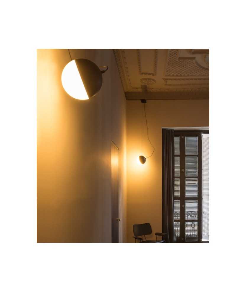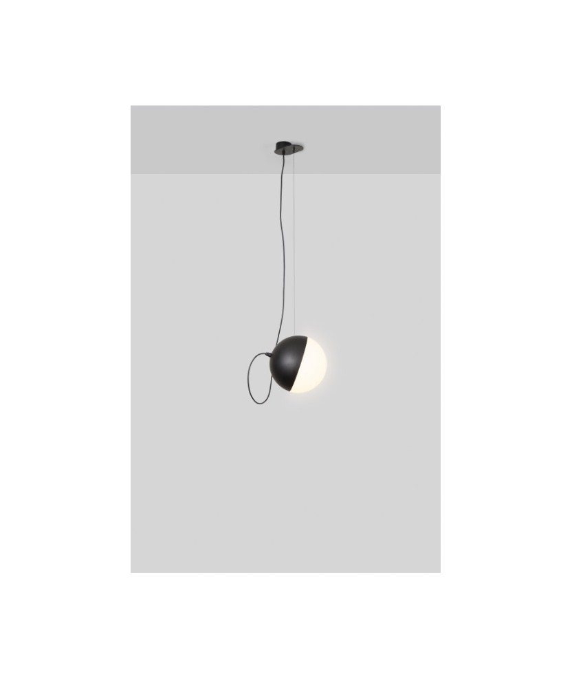 Luz minimalista y versátil. La lámpara colgante Half muestra nuevas coreografíes de la luz, bailando en el espacio i rotando sobre sí misma. La simplicidad del círculo y los sutiles movimientos, narran un viaje cósmico con un largo camino de posibilidades, alturas y posiciones. Esfera compuesta por dos medias bolas, la primera lacada en negro mate, y la segunda, la pantalla difusora, de vidrio opal satinado. Cable eléctrico de 2 m. Medida: 160 cm. Medida esfera: 25 cm de diámetro.