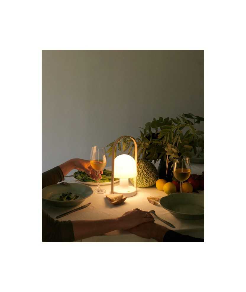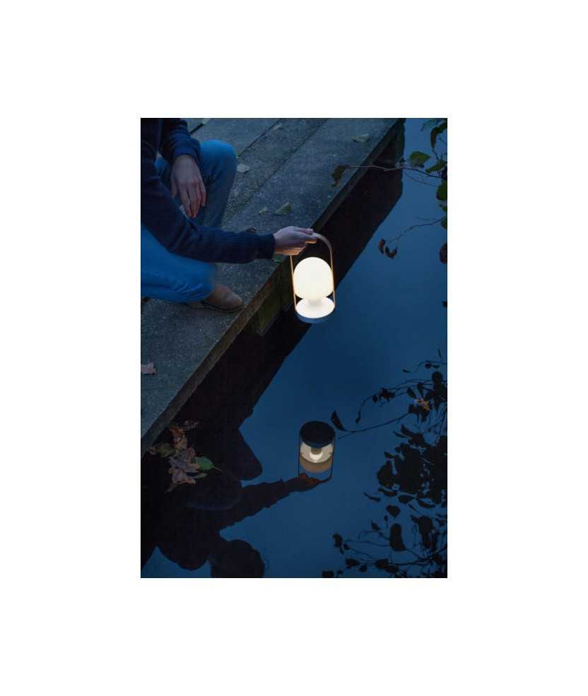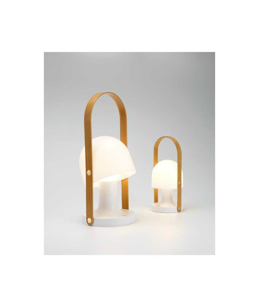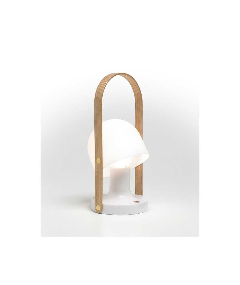 Sus reducidas dimensiones y su batería recargable, permiten llevarla allí donde más se necesite, ya sea en interiores de vivienda o en exteriores sin acceso a enchufe. Su asa de roble invita a cogerla, y junto con su pantalla basculante de policarbonato blanco, recuerdan un farolillo. Con tecnología LED. Batería incorporada con entrada USB para su recarga. Medidas: 12,3x12,3x28,8 cm. Ganadora del Premio Red Dot, 2016.