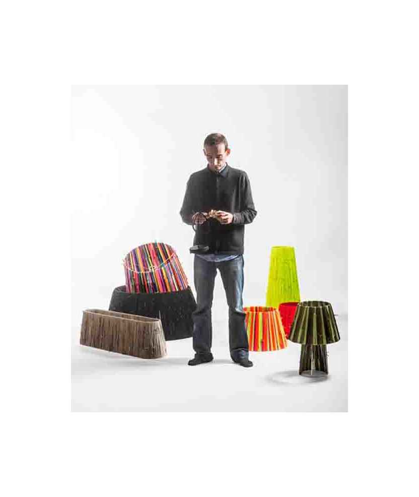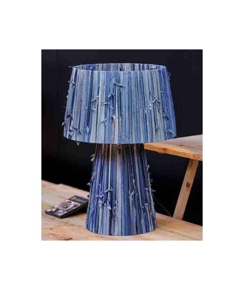 La lámpara Jeans de Curro Claret es una versión renovada de su colección original de lámparas para Metalarte, hechas con cordones de zapatos. Este modelo utiliza vaqueros de segunda mano y se fabrica en colaboración con la Fundación Arrels y Back to Eco, con el objetivo de generar oportunidades laborales para personas en situación de vulnerabilidad. Esta pieza de diseño social busca unir sostenibilidad, artesanía y responsabilidad social. Forma parte de la colección del Dhub. Medidas: 40x28 cm.