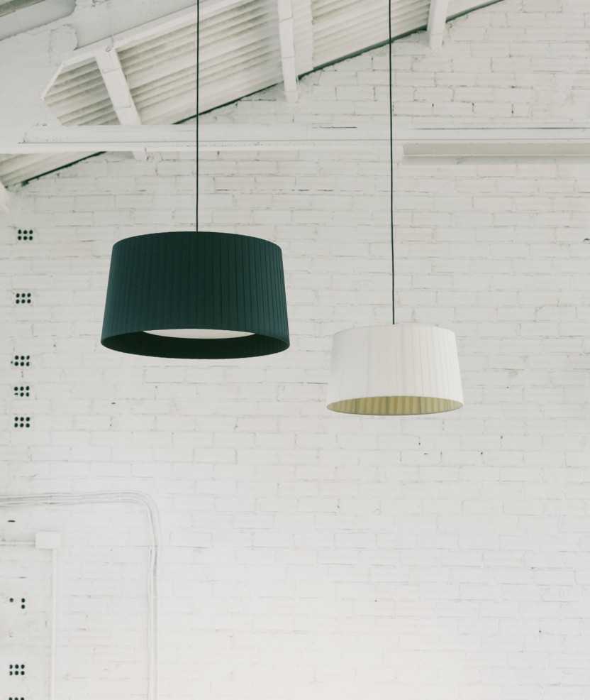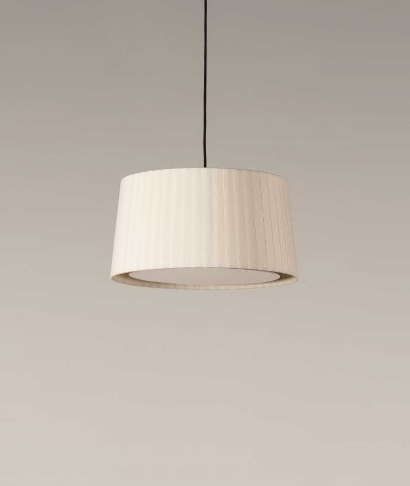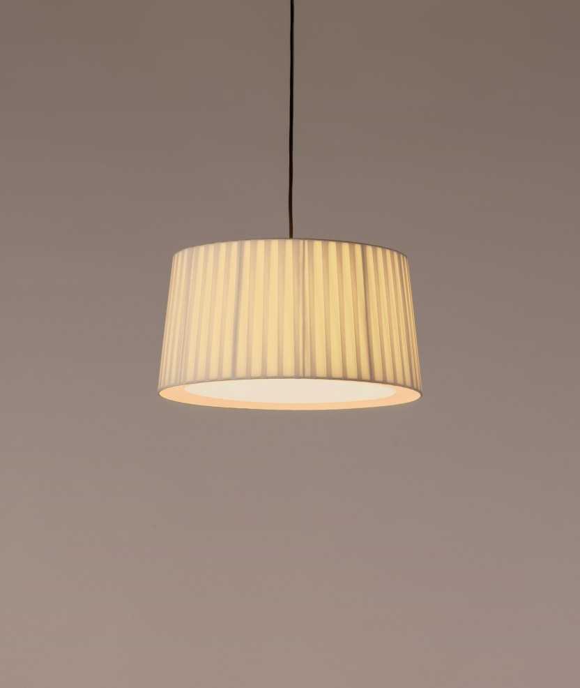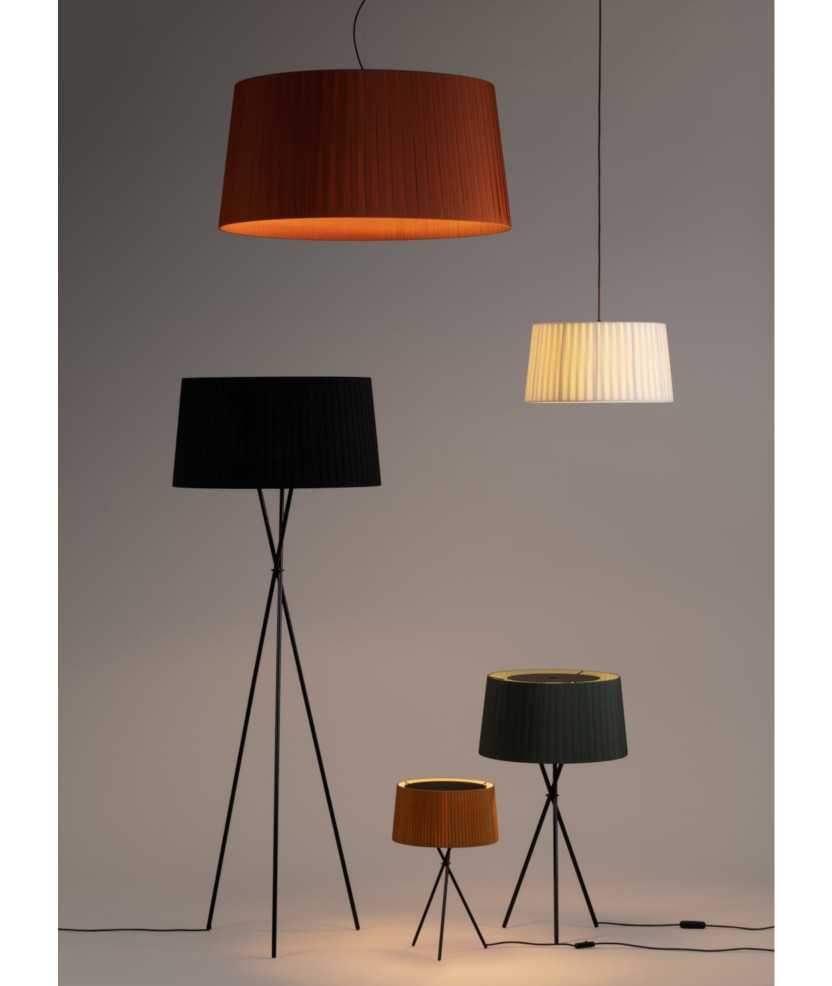 La lámpara GT6 está pensada para áreas domésticas. Su pantalla encintada de forma manual da carácter a cualquier espacio. Diseñada por el Equipo Santa & Cole en 1994. En esta versión, la pantalla es de cinta en crudo con florón de níquel satinado y cable negro. Medidas: 325x40 cm.