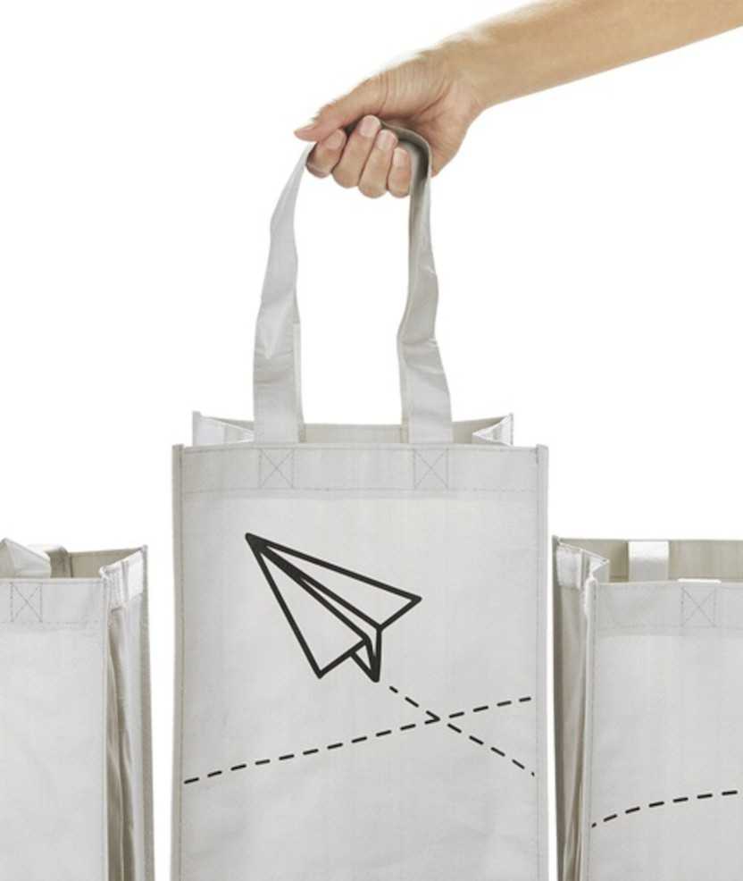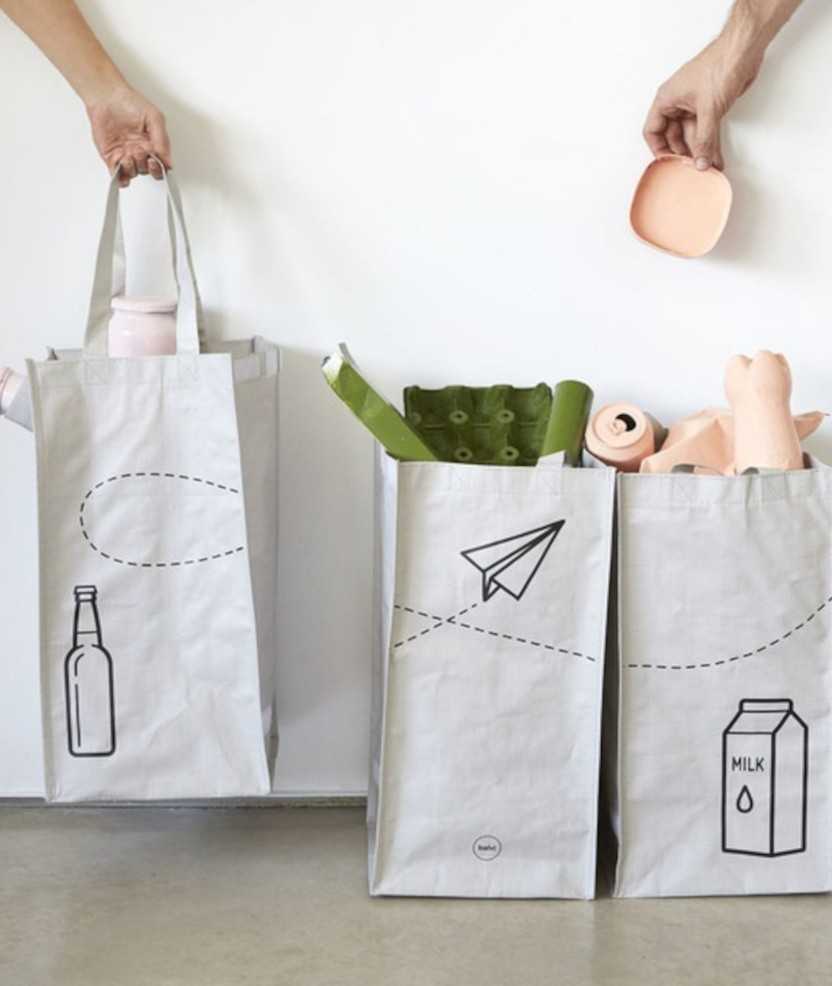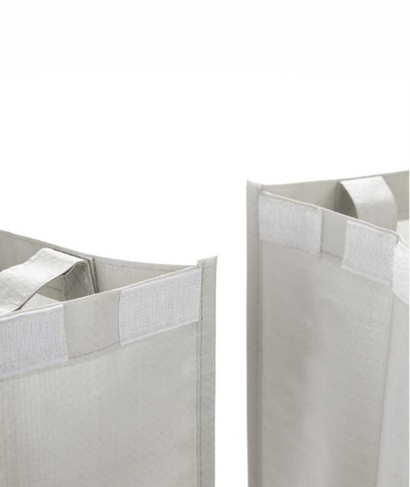 Set de 3 bolsas para separar y reciclar la basura. Su color neutro y sus asas permiten ponerlas en cualquier sitio. Se pueden enganchar entre sí mediante las tiras de velcro cosidas en los laterales. Fabricadas con polipropileno reciclado. Medidas: 43x66x22 cm.