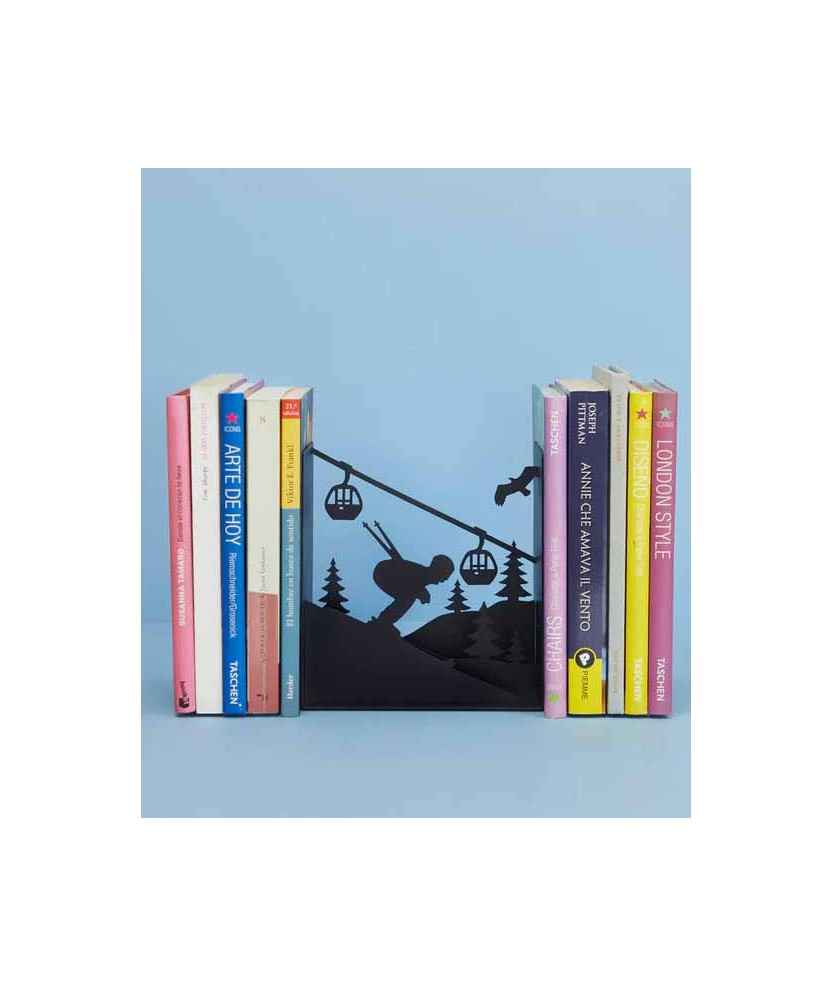Sujetalibros de una sola pieza con diseño inspirado en un paisaje de esquí, con pinos, situado entre tus libros favoritos. Fabricado en metal duradero con topes antideslizantes para garantizar estabilidad. Robusto y funcional, aporta un toque de montaña y encanto a cualquier estantería, escritorio o rincón de lectura. Ideal para amantes del esquí y de los paisajes alpinos. Material: metal. Medidas: 16x15x10 cm.