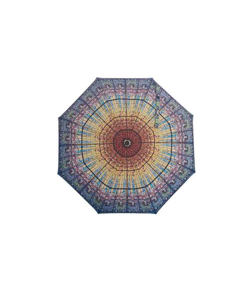 Paraguas plegable con el diseño inspirado en el lucernario de la Sala de Conciertos del Palau de la Música. En forma de gota gigante, esta claraboya imita un exuberante sol, pendido de un cielo azul estampado con rostros de ninfas. Con mango de plástico y apertura automática. Contiene una funda con el mismo diseño para guardarlo. Medida paraguas cerrado: 31 cm.