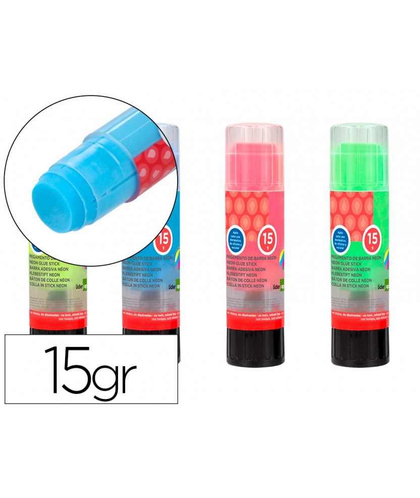 Pegamento liderpapel en barra 15 g trazo magico color neon surtido unidad . Lápiz adhesivo de alta calidad. Máximo deslizamiento sobre el papel. Secado rápido, no humedece el papel. No deja grumos ni filamentos. Para papel, cartón, fotos, telas, etc. Apto para uso escolar y en oficinas. Sin disolventes. Cuando se desliza la barra por el papel deja la marca de color para ver más fácilmente donde se ha puesto el pegamento. Colores neón: celeste, amarillo, rosa, verde. Contenido 15 g.