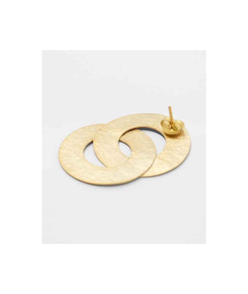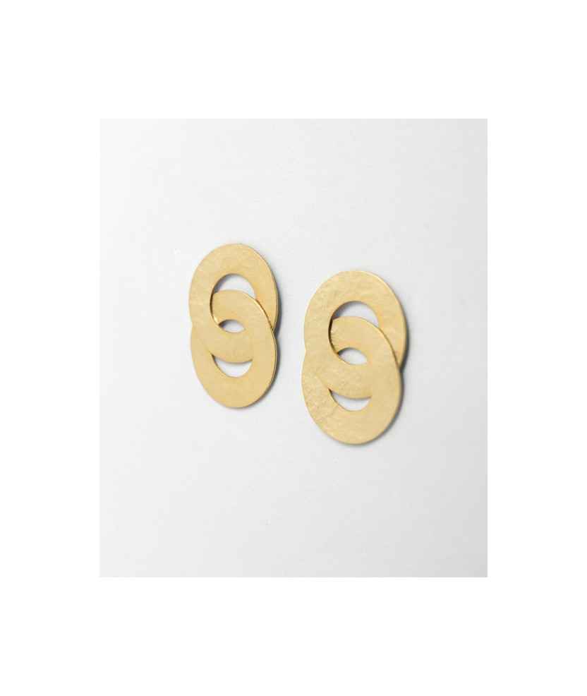 Pendientes compuestos por dos círculos planos entrelazados, con acabado martelé y baño de oro. Un diseño artesanal que combina equilibrio y un movimiento sutil, aportando una textura singular y personal a la pieza. Hechos a mano con cuidado y detalle, son una joya que resalta por su elegancia y distinción. Medida: 5,5 cm.