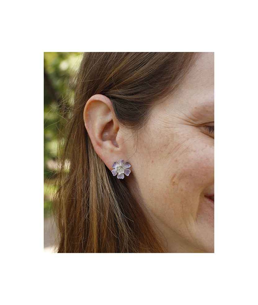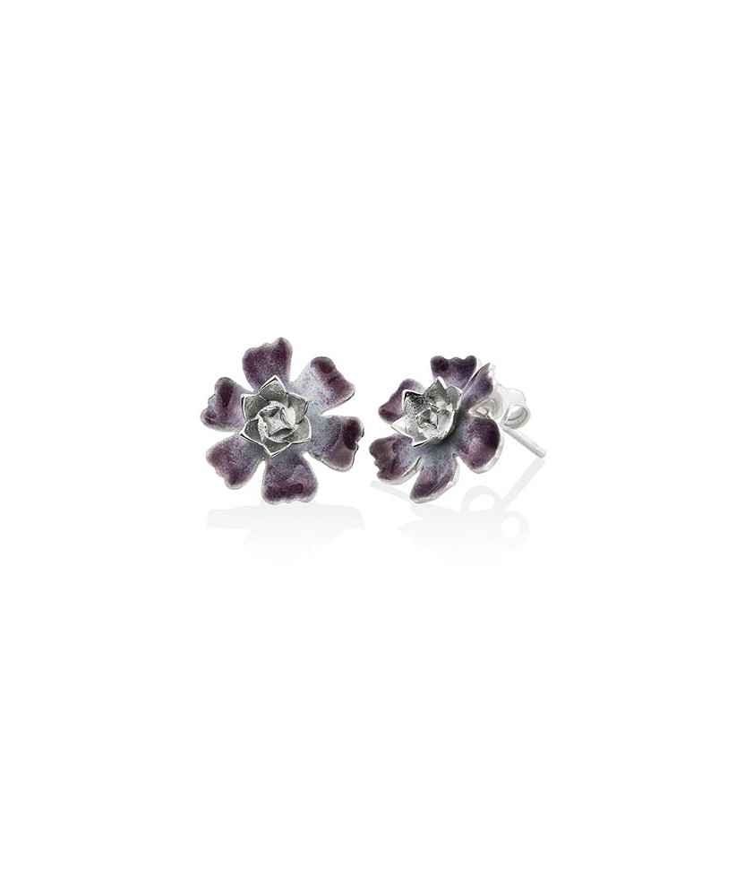Pendientes con la flor de Magnolia, inspirado en el árbol milenario que decora y acompaña la calle Gran de Gràcia (Barcelona). Ésta es una flor muy valorada en la cultura catalana y es uno de los símbolos de la primavera en la ciudad. De plata y esmalte al fuego de colores violetas. Joya diseñada de manera artesanal en Barcelona. Cierre a presión. Medida flor: 1,6 cm de diámetro.