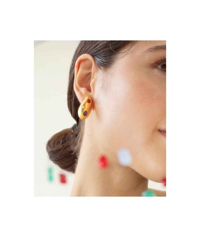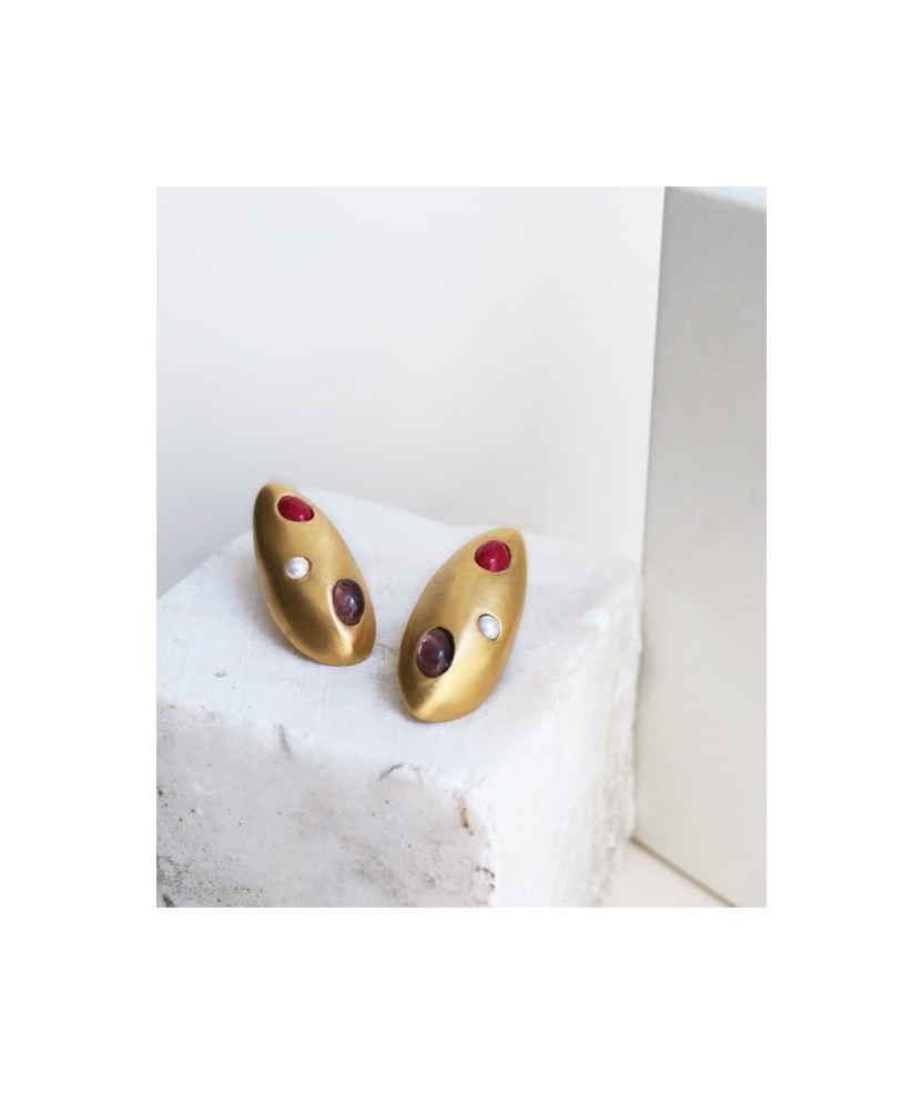 Pendientes de forma ovalada con incrustaciones de cristales de Murano en tonalidades malvas y perlas de resina de alta durabilidad. Una joya que evoca fragmentos de sueños marinos de la costa menorquina. Fabricado en metal mate con baño de oro de 24 K. Cierre con presión.