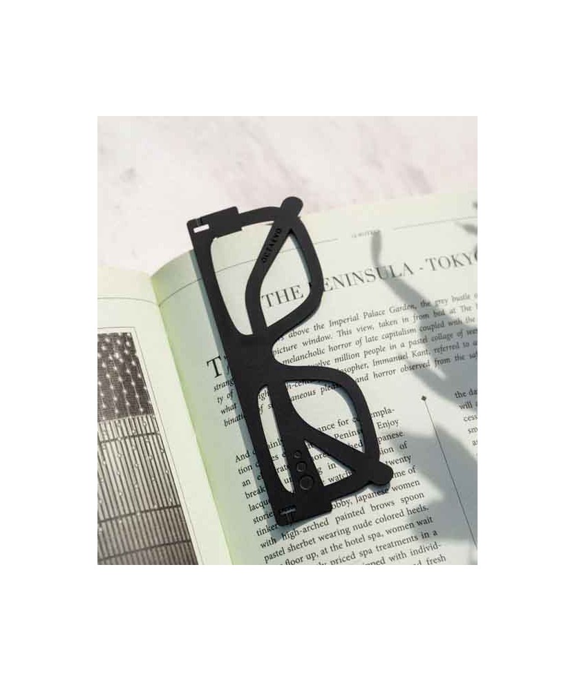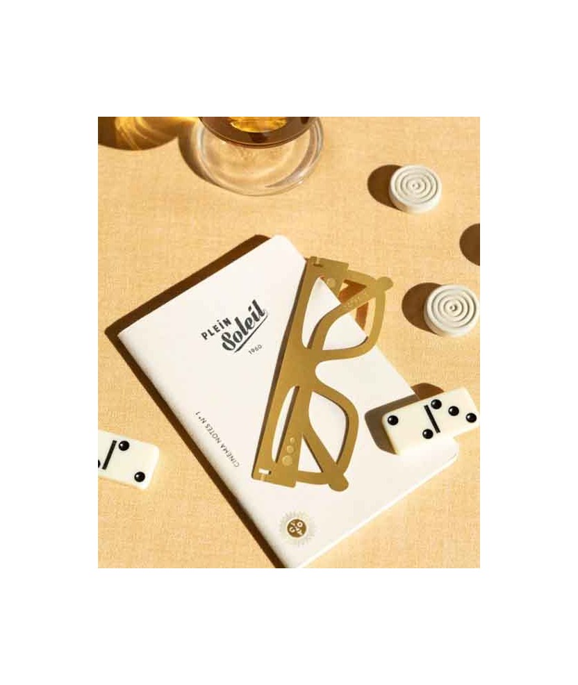 Marcador de páginas metálico inspirado en las Riviereas mediterráneas de los años sesenta, con el encanto del glamour y las estrellas de cine. Tiene la forma de unas gafas de sol elegantes y se desliza suavemente entre las páginas como un guante de seda. Acabado con un ligero brillo y presentado sobre un soporte serigrafiado de cartón grueso, en formato postal. Una pieza refinada y práctica que une diseño y funcionalidad. Medida: 117 x 50 mm.