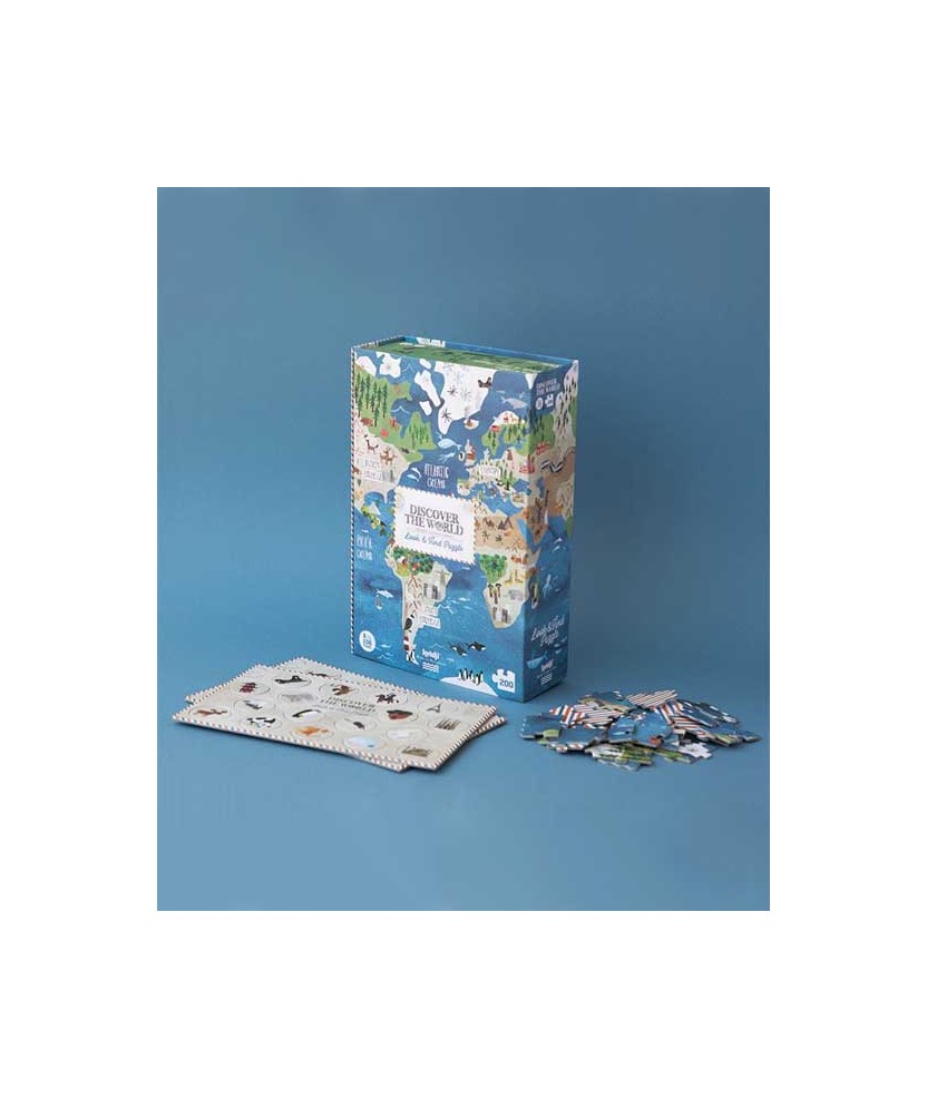 El gran planeta azul esconde muchos secretos. Este puzzle nos ayudará a descubrir alguna de estas maravillas. Primero resolveremos el rompecabezas, después buscaremos la Torre Eiffel, Big Ben o el oso panda entre muchos otros. ¿Las encontrarás todas? Un puzzle del mapa del mundo y un juego de observación. ¡Un juguete didáctico con el que aprenderemos geografía mientras nos divertimos! ¿Dónde está Australia? Ilustración de Carmen Saldaña. Hecho en Barcelona. Medidas: 6x48 cm. Edad: +3 años.