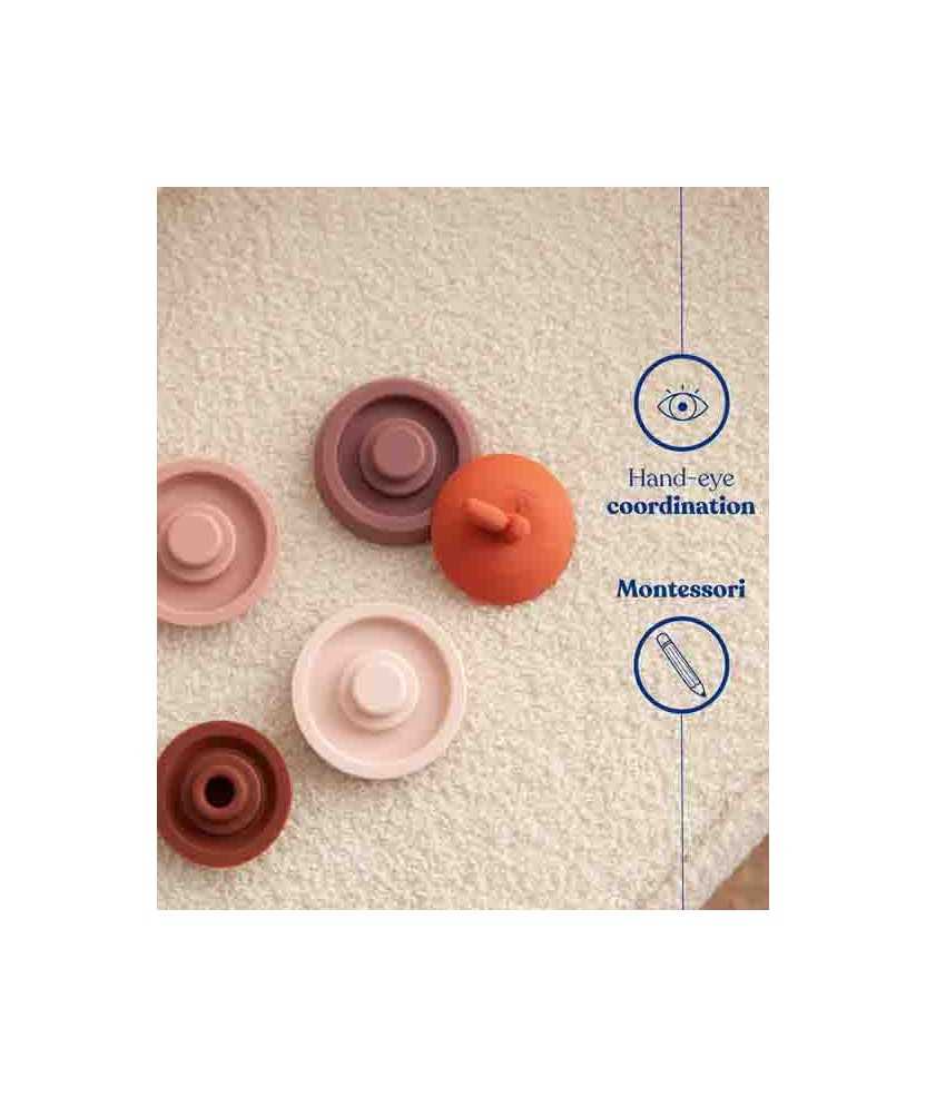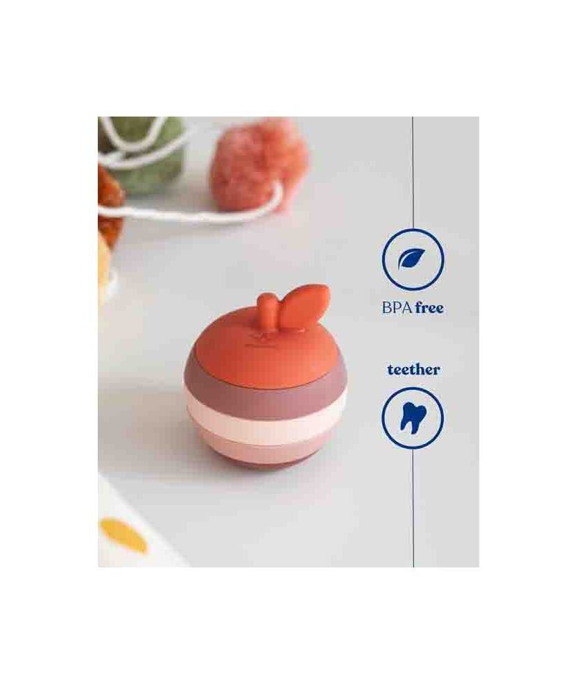 Juguete de silicona ecoamigable, libre de BPA y ftalatos, seguro para bebés. Su divertido diseño en forma de manzana de 5 piezas estimula la imaginación y el juego creativo. Compacto y portátil, ideal para llevar a cualquier lugar. Favorece la coordinación, las habilidades espaciales y el desarrollo creativo. También funciona como mordedor y juguete de baño, práctico y versátil. Medidas: 8,3x7x7 cm.