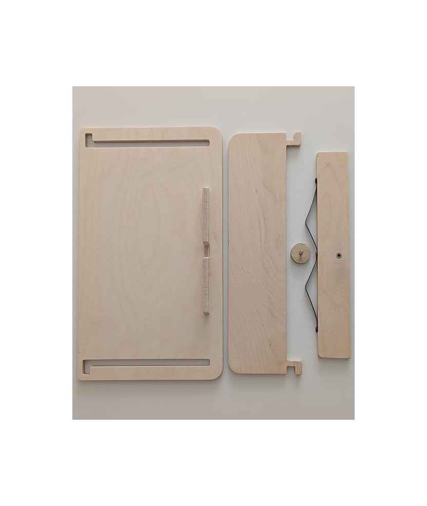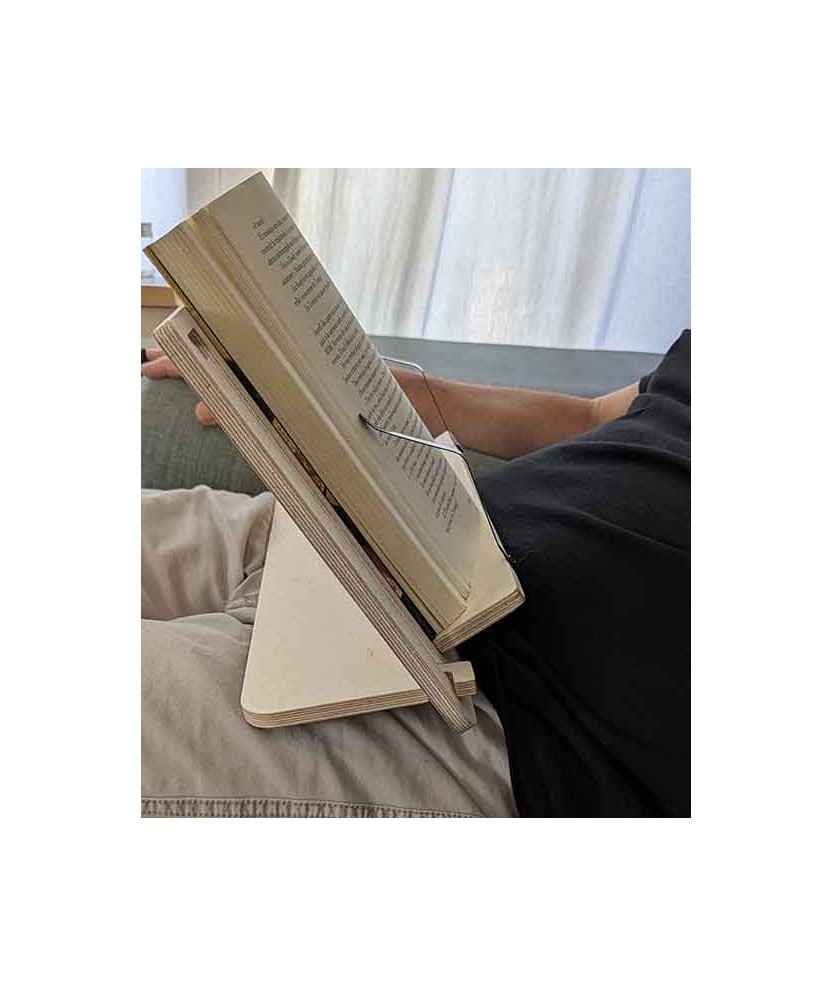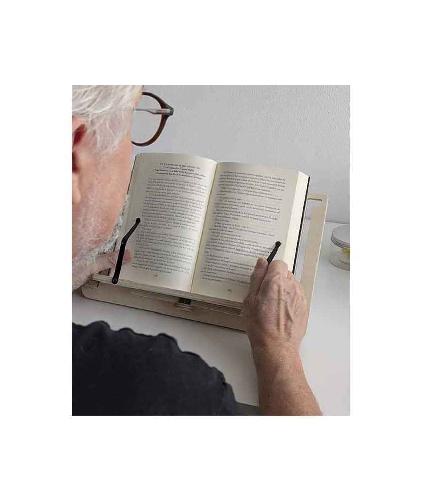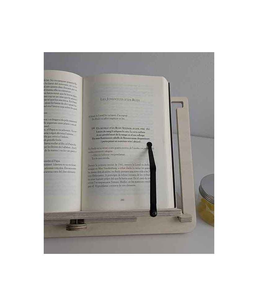 Soporte ajustable para libros, e-books, tabletas o partituras con inclinación regulable. Incluye dos varillas metálicas con puntas de silicona para mantener los libros abiertos sin dañarlos. Estable en cualquier superficie y fabricado con contrachapado de abedul de 9 mm de grosor. Ancho 37 cm, fondo 12 cm, peso 1 kg.