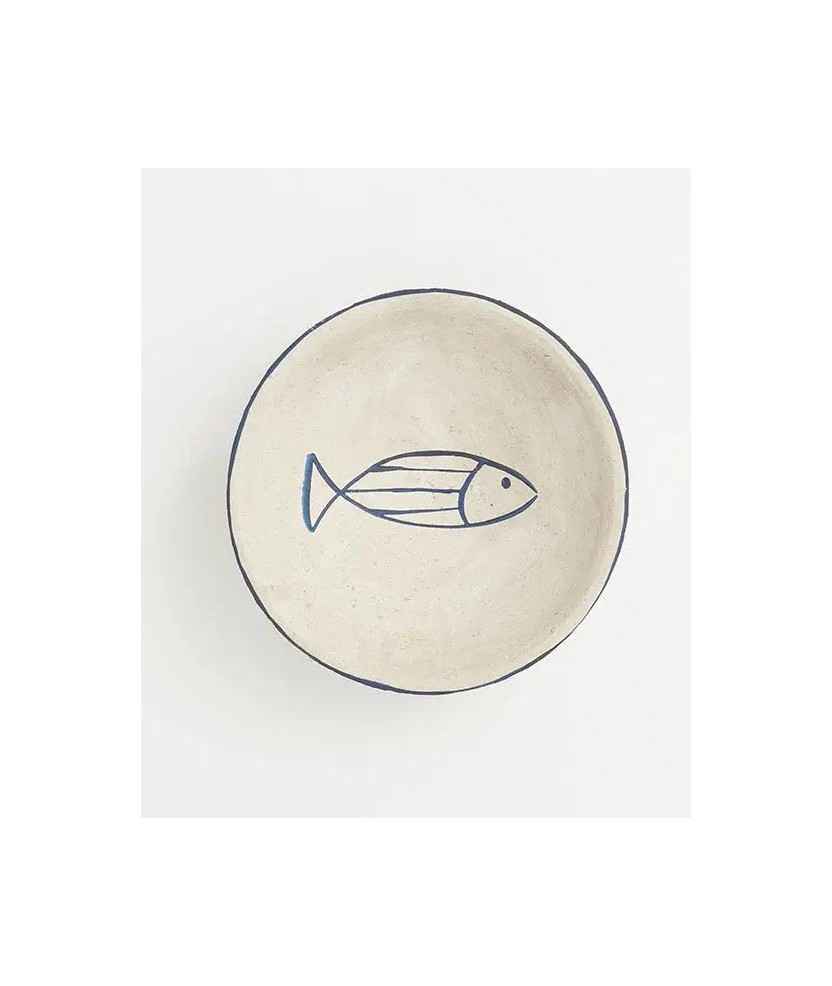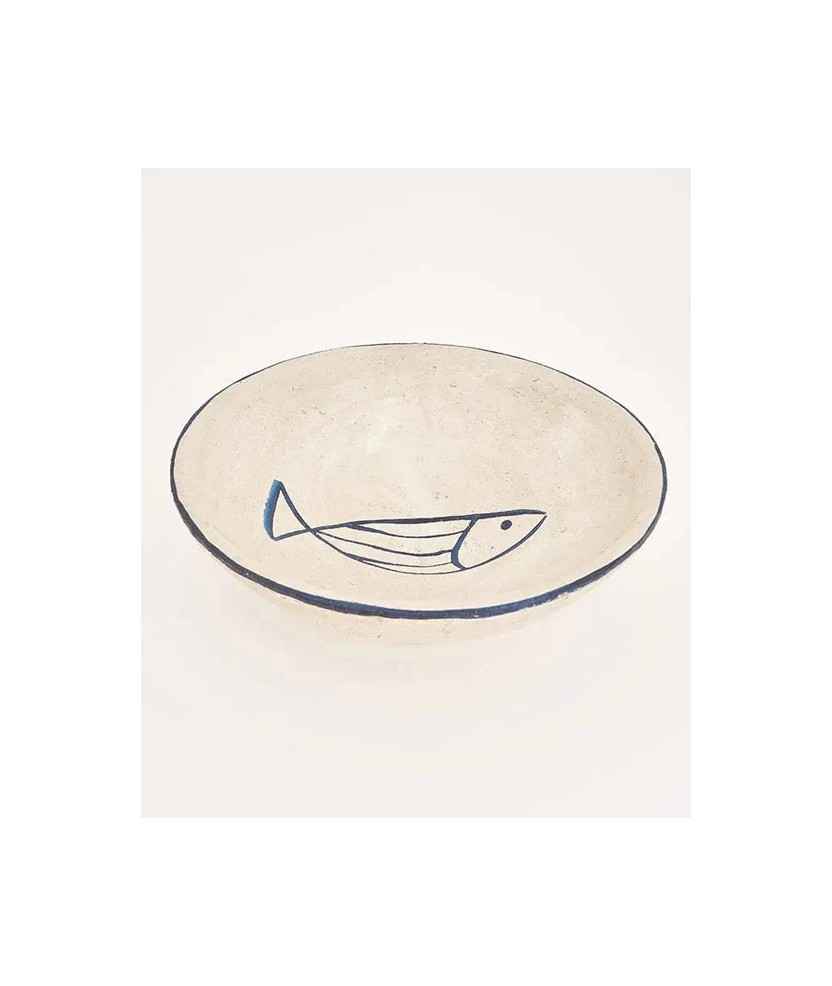 Plato hondo grande de terracota con un pez dibujado, que aporta un estilo rústico y auténtico a la mesa. La superficie amplia permite servir distintos platos mientras el detalle del pez añade un toque marino distintivo y decorativo. Ideal para combinar con otras piezas de terracota y crear un conjunto armonioso. Medidas: Ø29,5x9,5 cm.