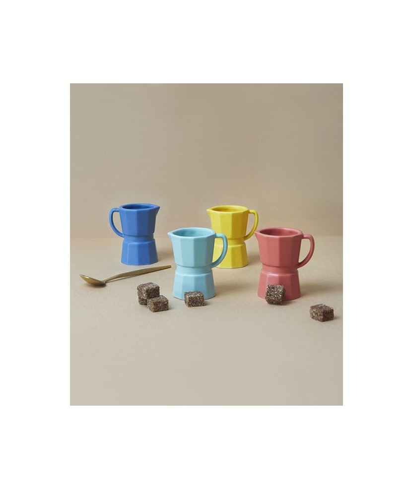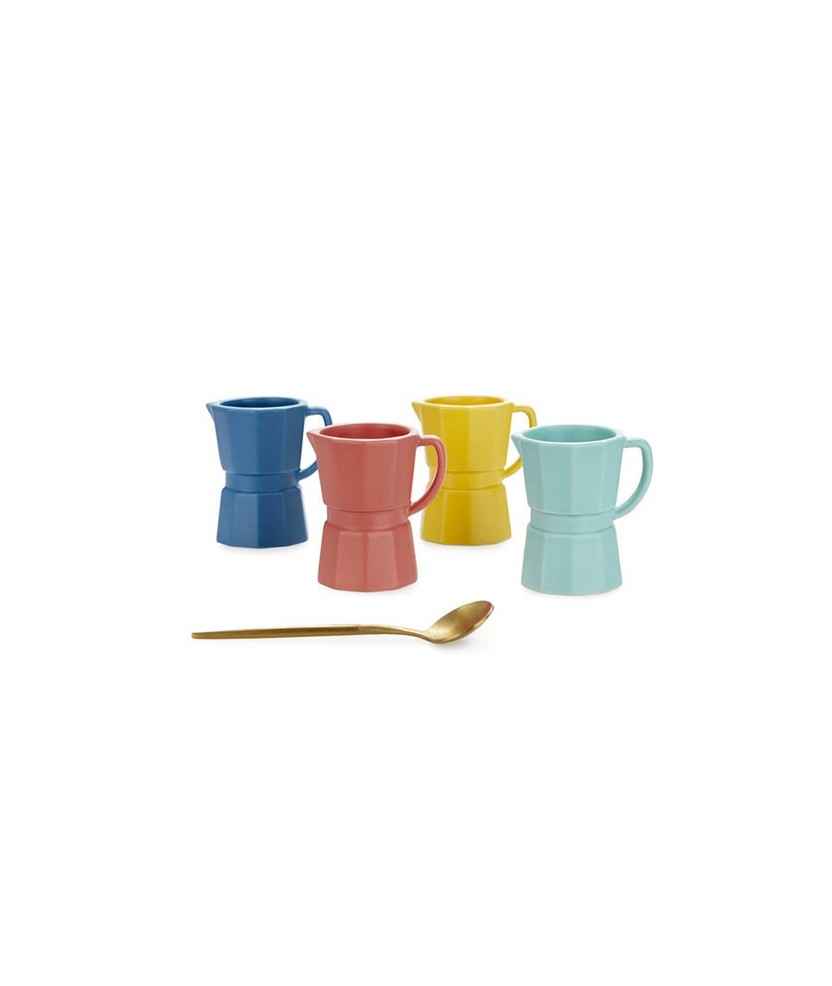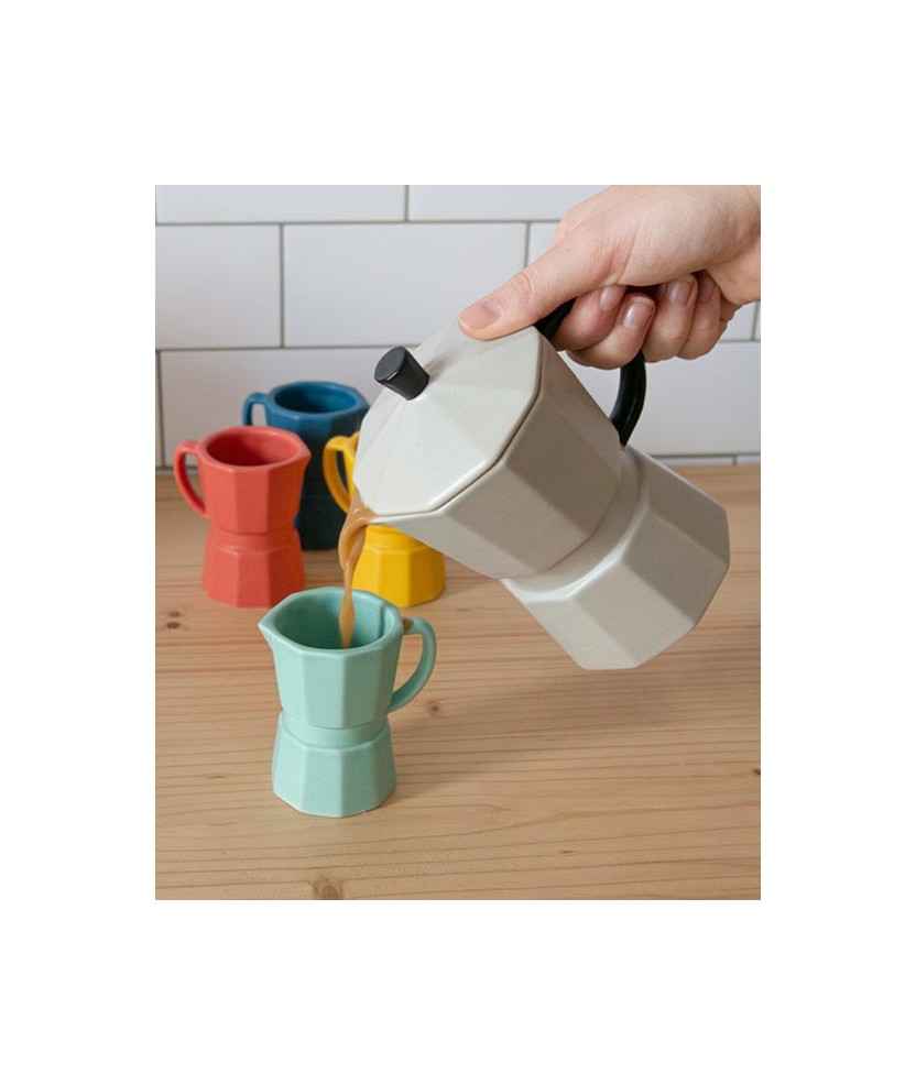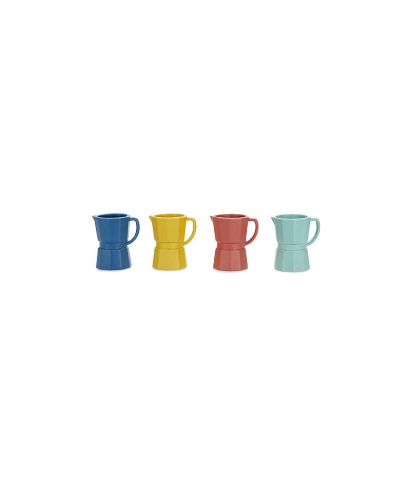 Set de 4 tacitas de café en forma de cafetera tradicional italiana. Ideal para servir café espresso (25-30 ml) o café largo (45 ml). Cada taza es de un color diferente: amarillo, azul marino, rojo y azul cielo. Fabricadas en cerámica, son aptas para microondas y lavavajillas. Capacidad: máximo 60ml. Medidas: 6,9x6,3x4,9 cm.